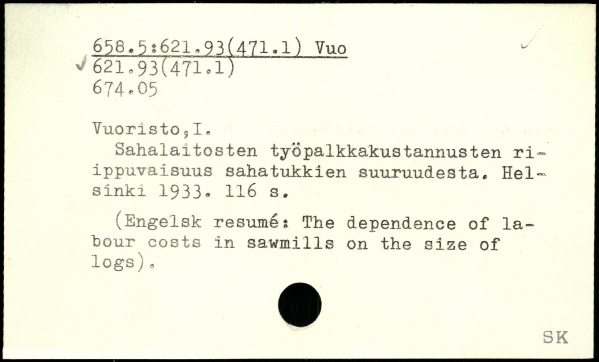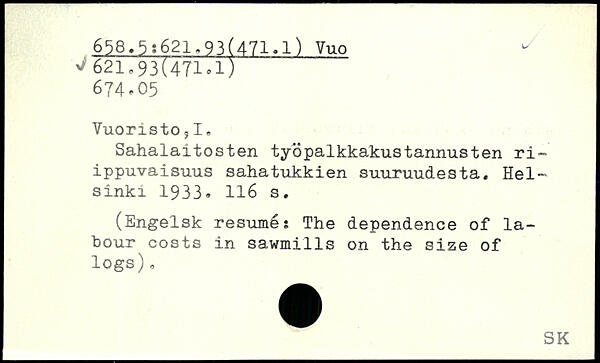 Sahalaitosten tyopalkkakustannusten ri-ippuvaisuus sahatukkien suuruudesta