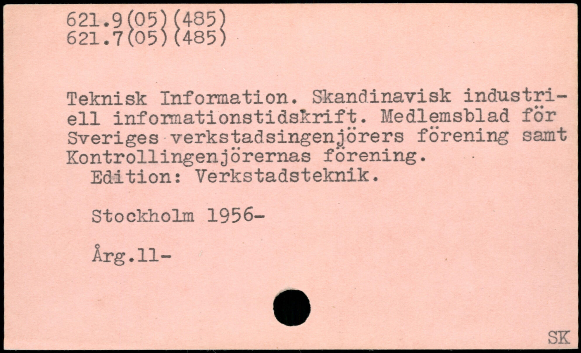 Teknisk Information. Skandinavisk industriell infomationstidskrift. Medlemsblad för Sveriges verkstadsingenjörers förening samt Kontrollingenjörernas förening. Edition: Verkstadsteknik.