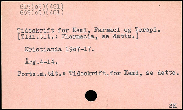 Tidsskrift for Kemi, Farmaci og Terapi. [Tidl.tit.s Pharmacia, se dette.] Kristiania 19o7-17. Årg.4-14. Forts.m.tit.: Tidsskrift,for Kemi, se dette. _SK