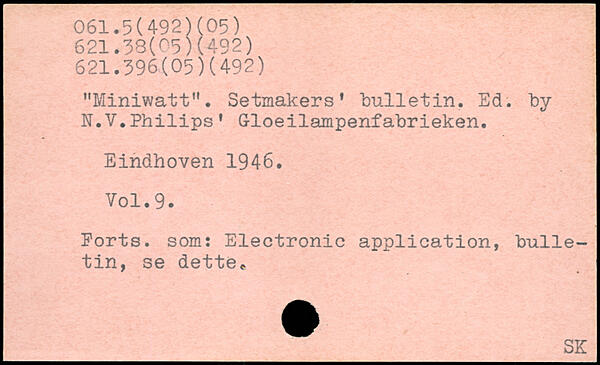 "Miniwatt". Setmakers. bulletin. Ed. by N. V. Philips. G-loeilampenfabrieken. Eindhoven 1946.