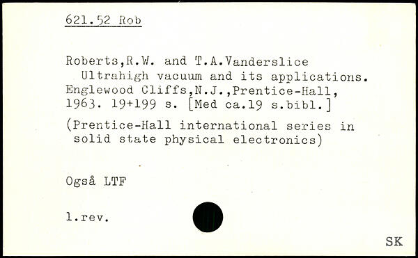 Roberts,R.V. and T. A. Vander slice Ultrahigh vacuum and its applications.