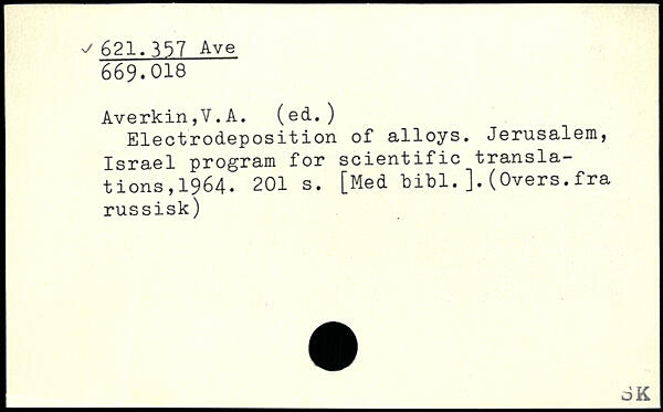 Electrodeposition of alloys. Jerusalem, Israel program for scientific translations, 1964. 201s. [Med bibl.].(Overs.fra russisk)