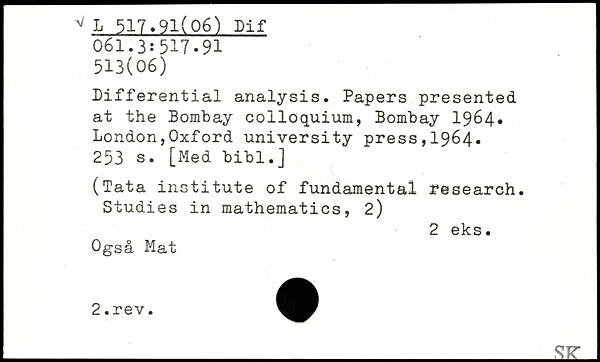 Differential analysis. Papers presented at the Bombay colloquium, Bombay 1964.