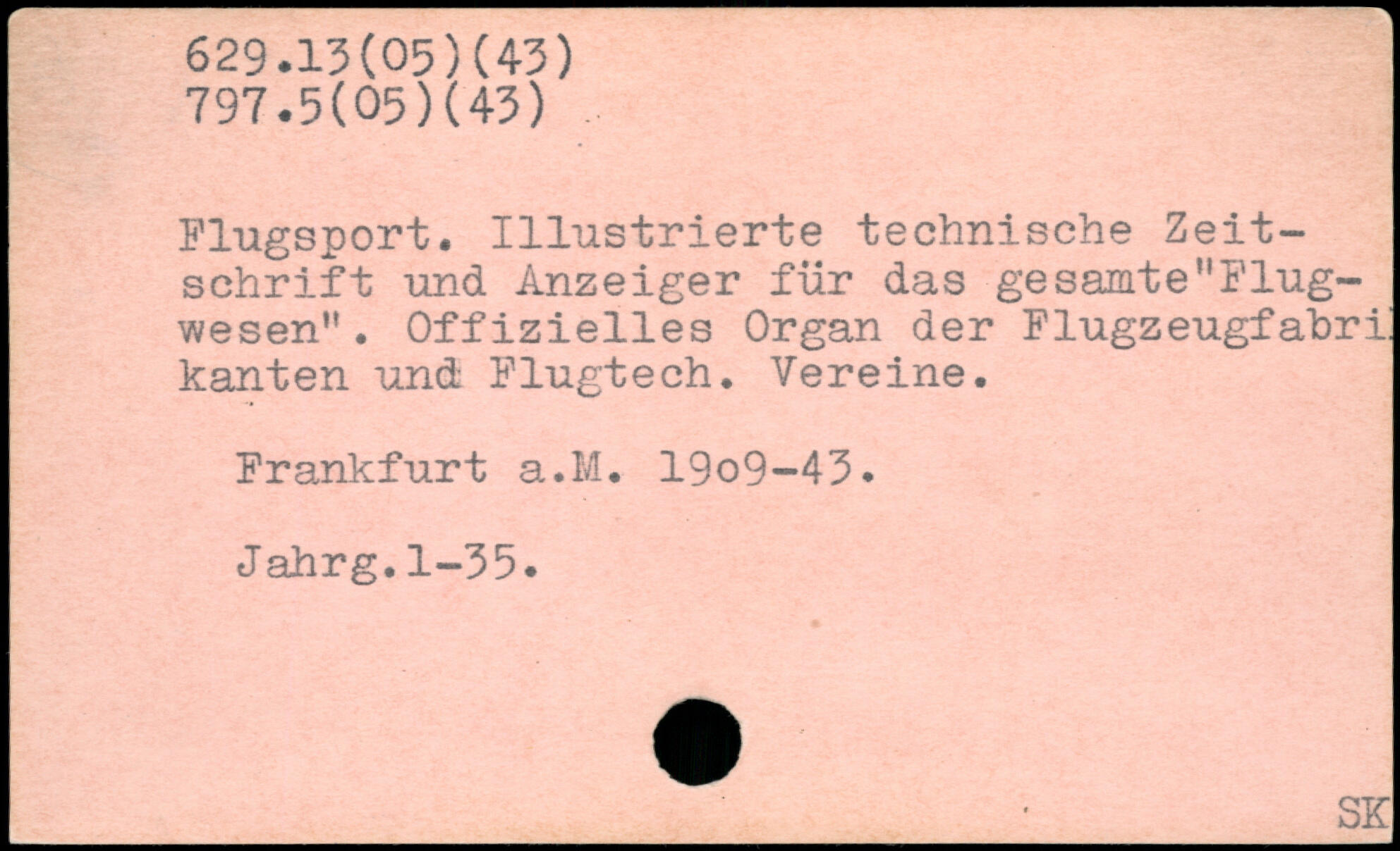 Flugsport. Illustrierte technische Zeitschrift und Anzeiger für das gesamte"Flugwesen”. Offizielles Organ der Flugzeugfabri kanten und Flugtech. Vereine. Frankfurt a.M. 19o9-43. Jahrg.1-35.