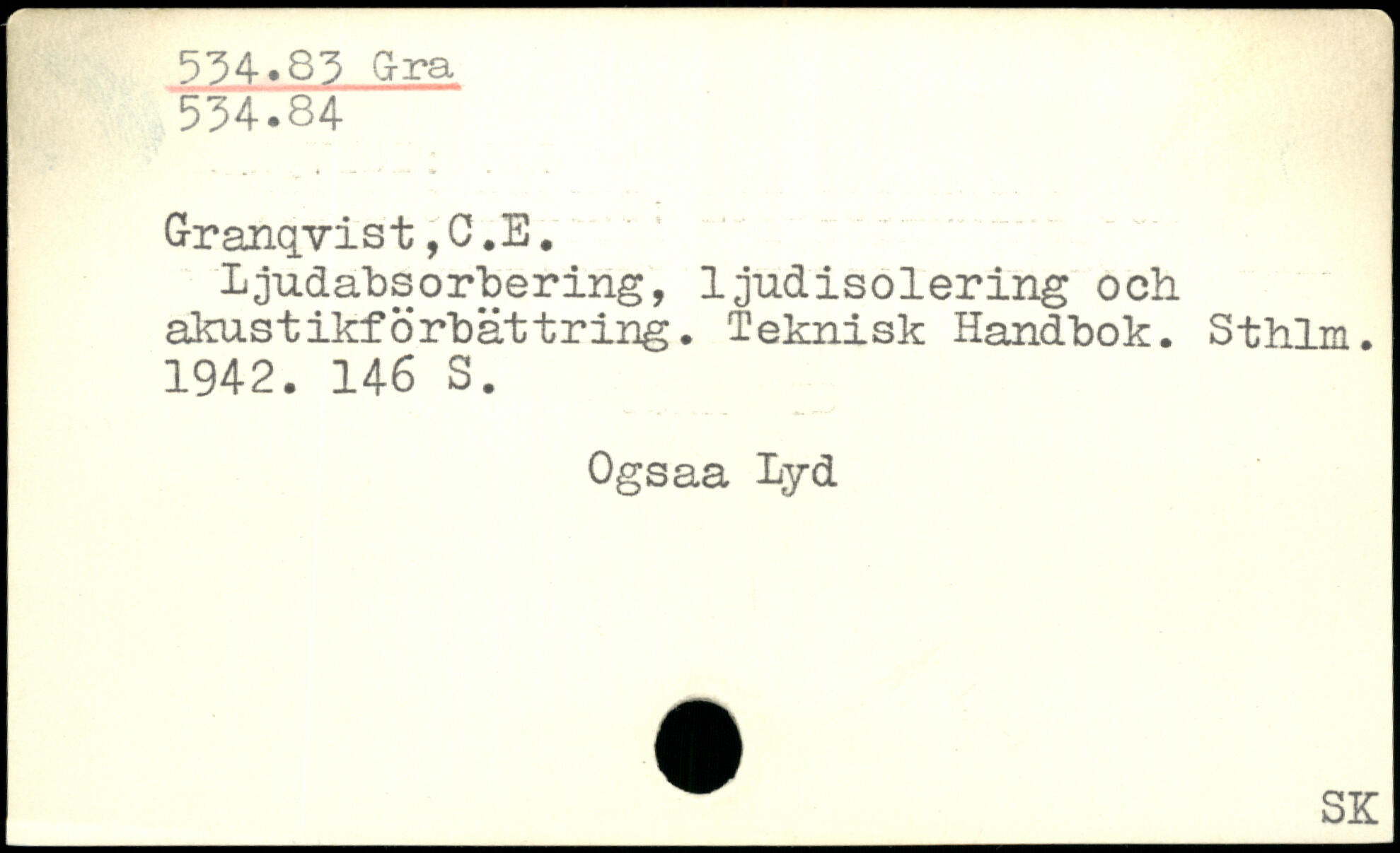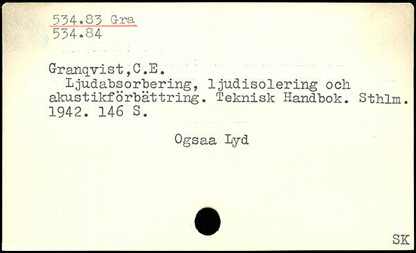 Ljudabsorbering, ljudisolering och akustikförhättring. Teknisk Handbok. Sthlm. 1942.