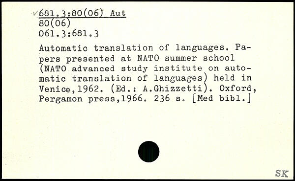 Automatic translation of languages. Papers presented at NATO summer school (NATO advanced study institute on automatic translation of languages) held in Venice,1962. (Ed.: A.Ghizzetti).