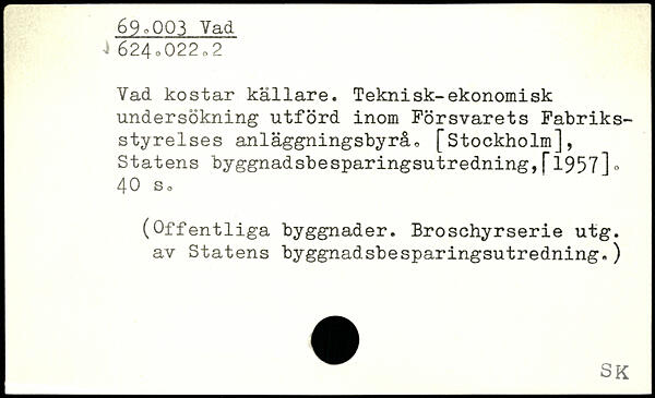 Yad kostar källare. Teknisk-ekonomisk undersökning utförd inom Försvarets Fabriks-styrelses anläggningsbyråo [Stockholm], Statens byggnadsbesparingsutredning,[1957]