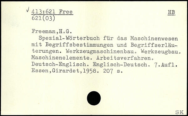 Spezial-Wörterbuch für das Maschinenwesen mit Begriffsbestimmungen und Begriffserläu-terungen. Werkzeugmaschinenbau, Werkzeugbau, Maschinenelementeo Arbeitsverfahren, Deutsch-Englisch, Englisch-Deutsch, 7,Aufl.