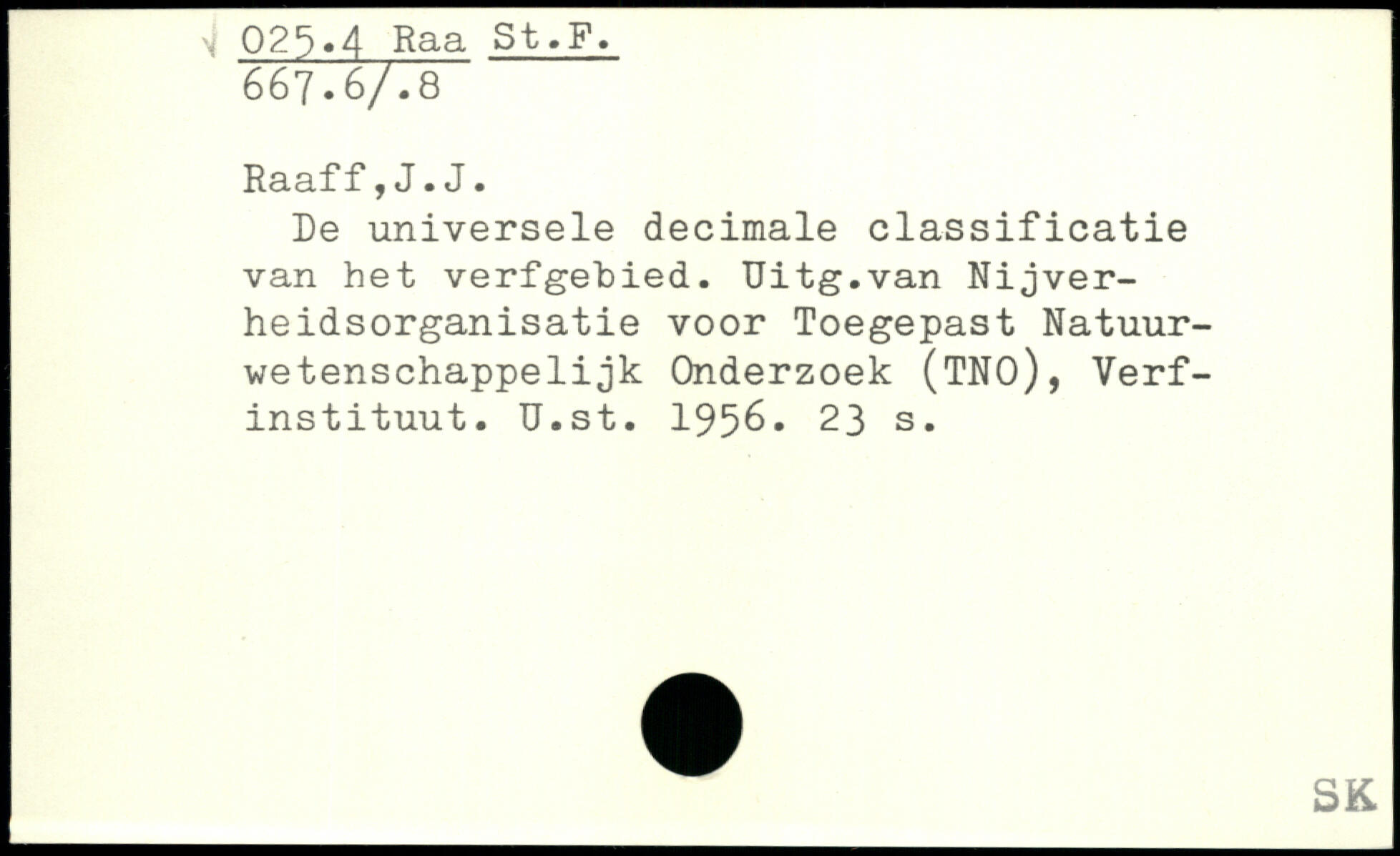 De universele decimale classificatie van het verfgetied. Uitg.van Nijver-heidsorganisatie voor Toegepast Natuur-wetenschappelijk Onderzoek (TNO), Verf-instituut. U.st. 1956.