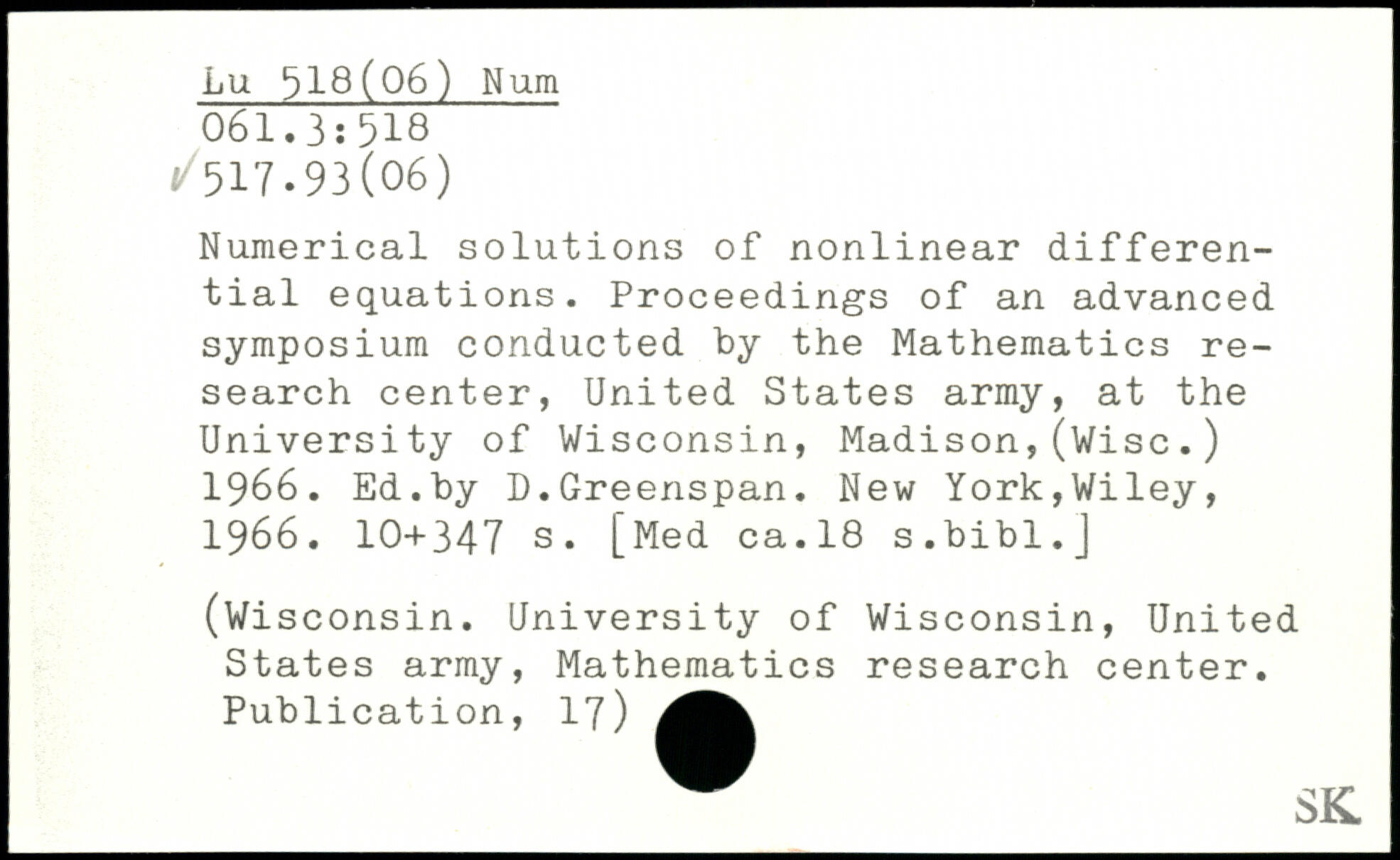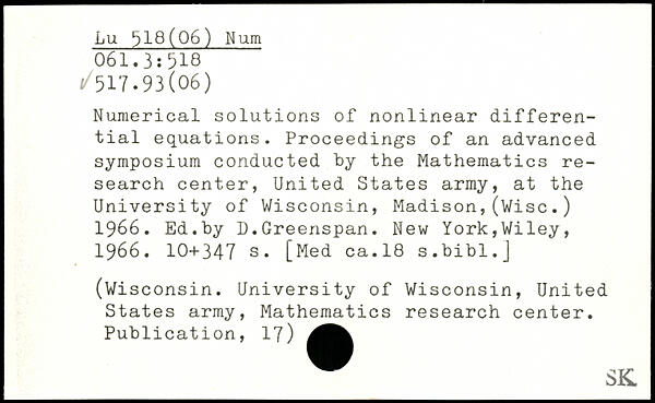 Numerical solutions of nonlinear differential equations. Proceedings of an advanced symposium conducted by the Mathematics research center, United States army, at the University of Wisconsin, Madison,(Wise.) 1966. Ed.by D.Greenspan.