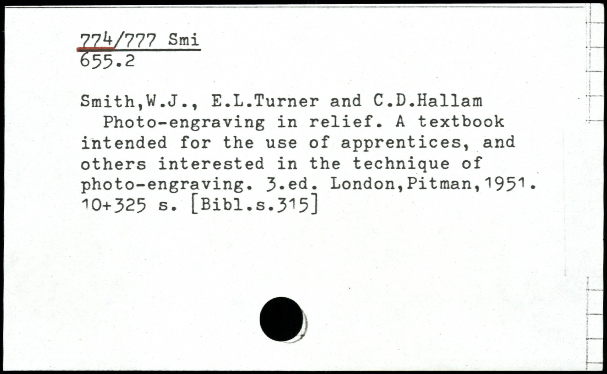 Smith,W.J., E.L.Turner and C.D.Hallam Photo-engraving in relief. A textbook intended for the use of apprentices, and others interested in the technique of photo-engraving.