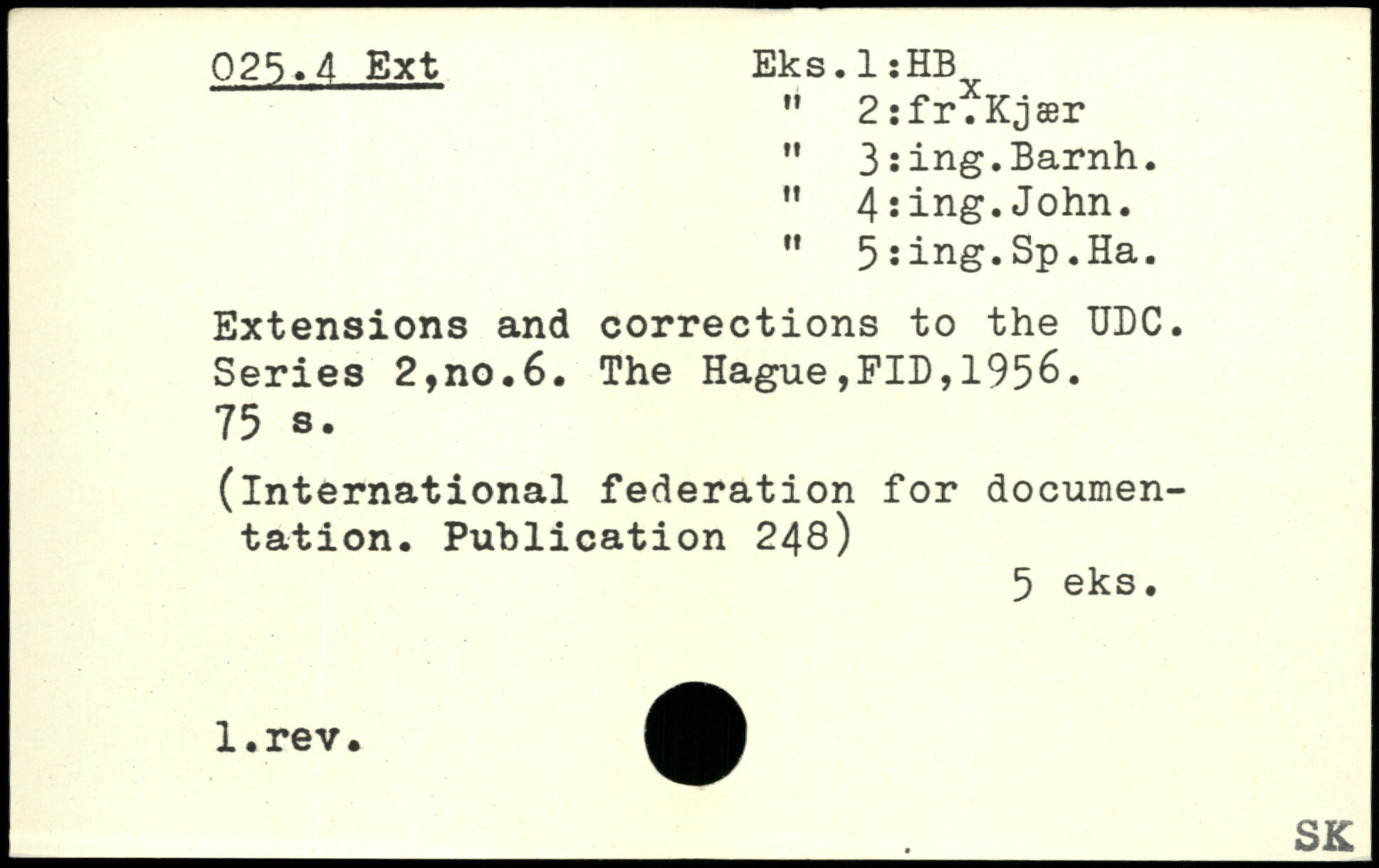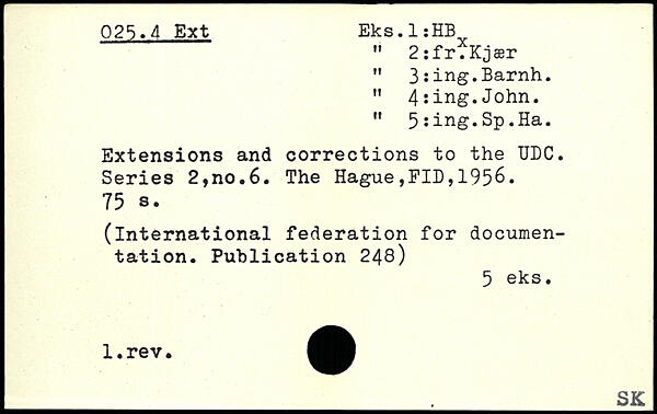 " 2:fr.Kjær " 3:ing.Barnh. " 4ïing.John. ” 5îing.Sp.Ha. Extensions and corrections to the UDC. Series 2,no.6.