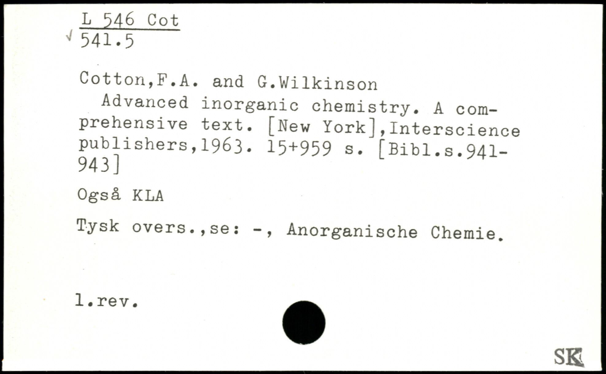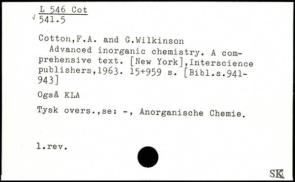 Advanced inorganic chemistry, A comprehensive text. [New York],Interscience publishers,1963.