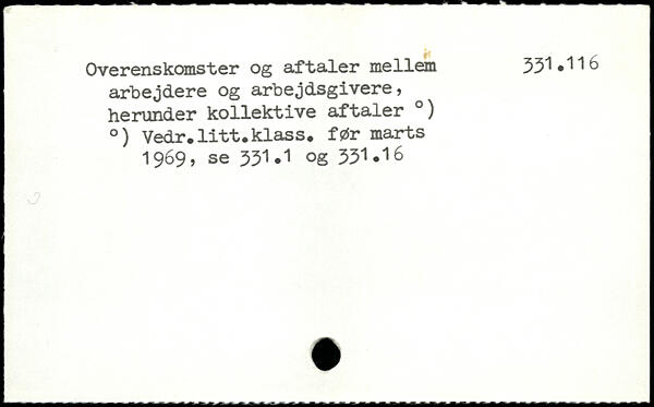 Overenskomster og aftaler mellem 331.116 arbejdere og arbejdsgivere, herunder kollektive aftaler .) .) Vedr.litt.klass. før marts 1969) se 351.1 og 331.16