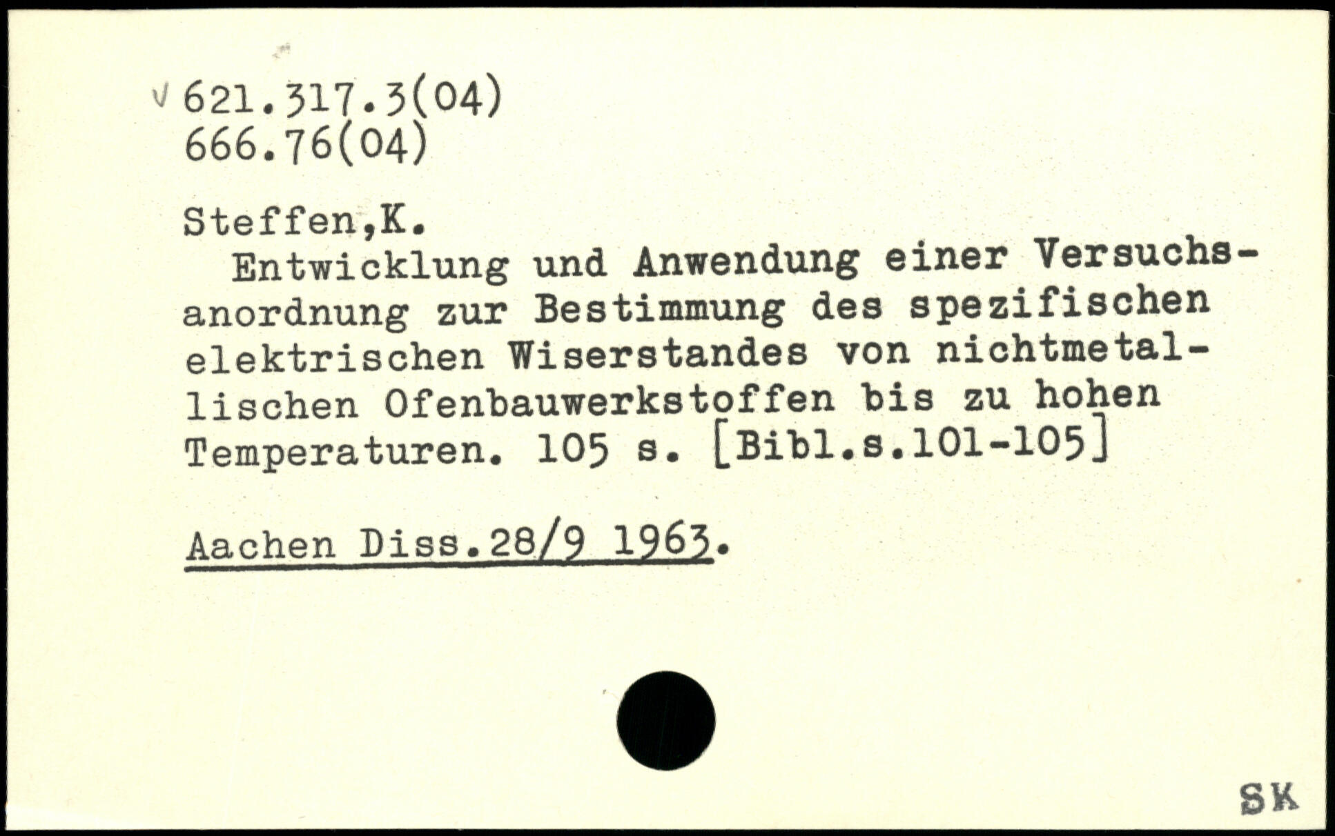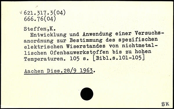 Entwicklung und Anwendung einer Versuchsanordnung zur Bestimmung des spezifischen elektrischen Wiserstandes von nichtmetallischen Ofenbauwerkstoffen bis zu hohen Temperaturen.