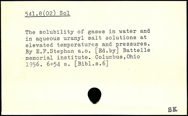 The Solubility of gases in water and in aqueous uranyl salt solutions at elevated temperatures and pressures. By E.F.Stephan a.o. [Ed.by] Battelle memorial institute. Columbus,Ohio 1956.