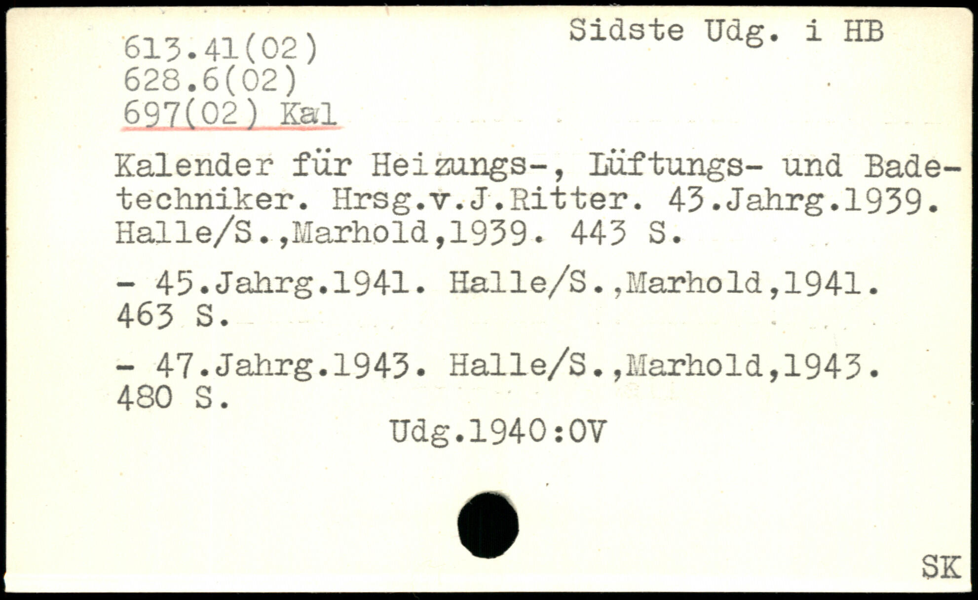 Sidste Udg. i HB 628.6(02) 697(02) Kaj Kalender für Heizungs-, lüftungs- und Bade-teehniker. Hrsg.v.J.Ritter. 43.Jahrg.1939.