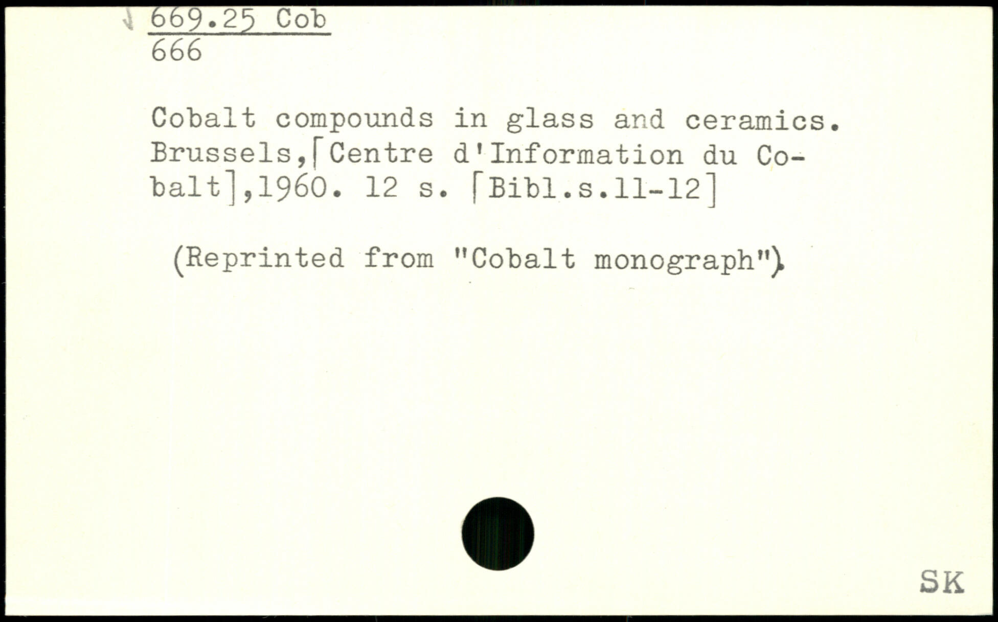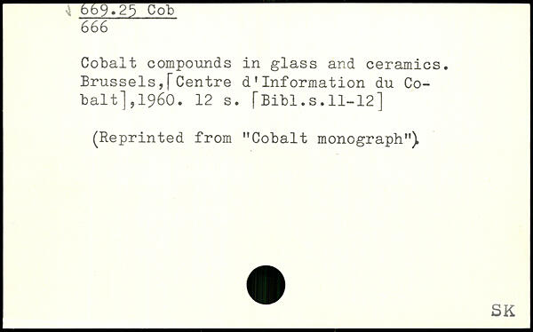 Cobalt compounds in glass and ceramics. Brussels,[Centre d'information du Cobalt], 1960.