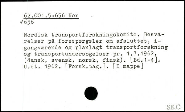 Nordisk transportforskningskomite. Besvarelser på forespørgsler om afsluttet, i-gangværende og planlagt transportforskning og transportundersøgelser pr. 1.7.1962, (dansk, svensk, norsk, finsk).