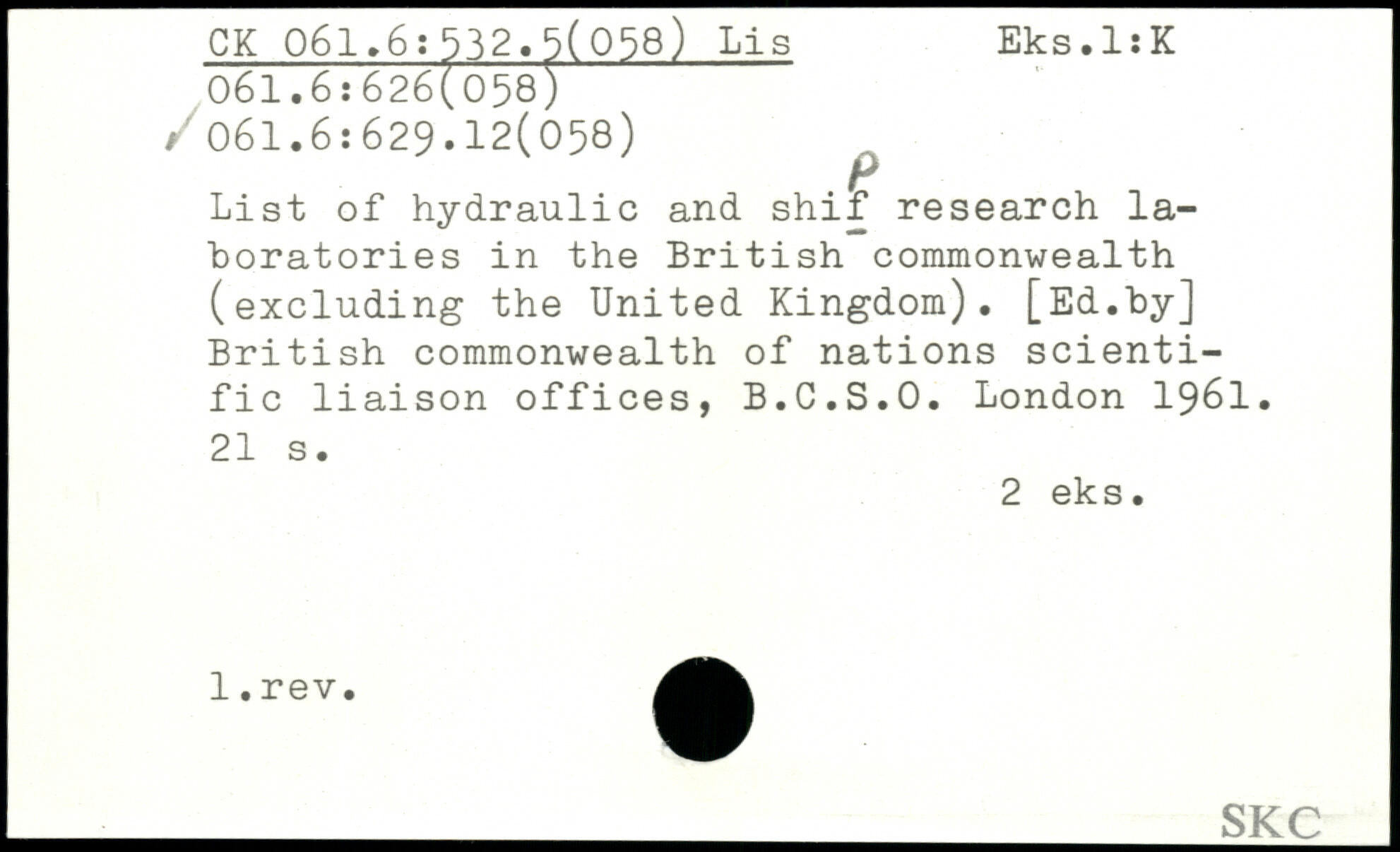 List of hydraulic and shif research laboratories in the British commonwealth (excluding the United Kingdom). [Ed.by] British commonwealth of nations scientific liaison offices, B.C.S.O.