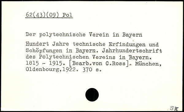 Der polytechnische Verein in Bayern Hundert Jahre technische Erfindungen und Schöpfungen in Bayern. JahrhundertSchrift des Polytechnischen Vereins in Bayern., 1815 - 1915, [Bearb.von C.Ross].