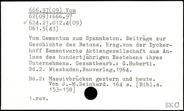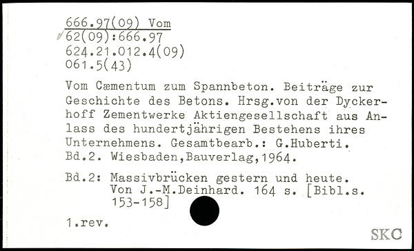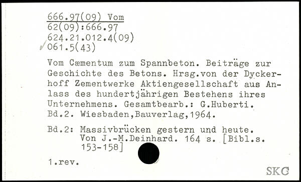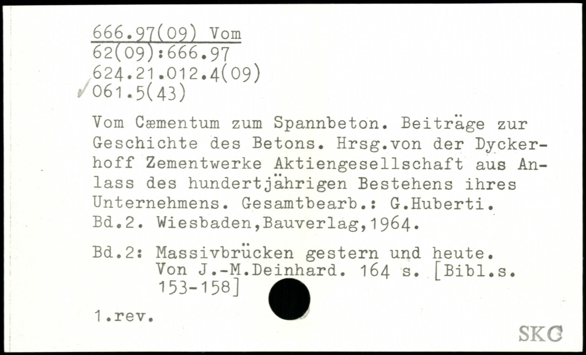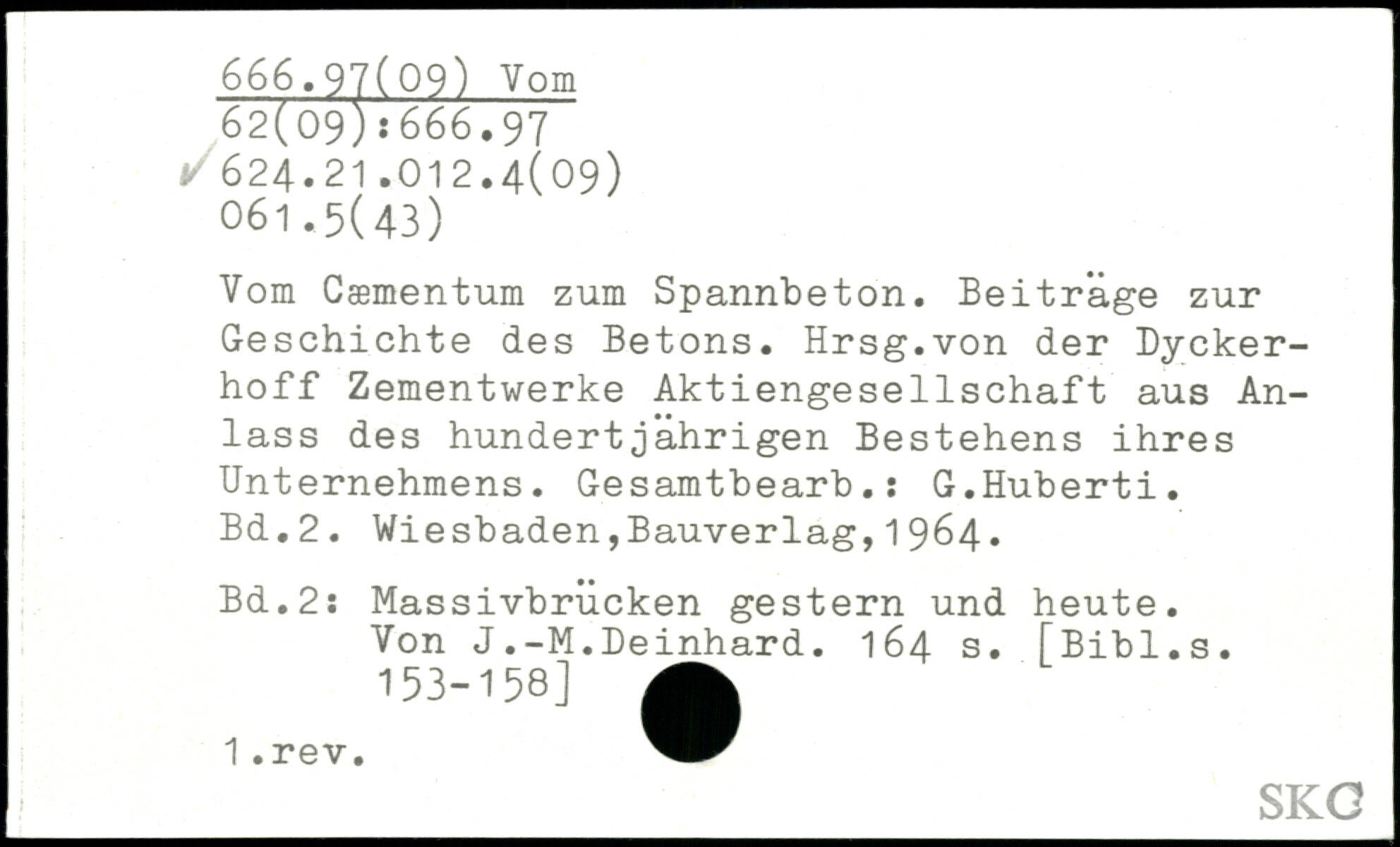Vom Csementum zum Spannbeton. Beitrage zur Geschichte des Betons. Hrsg.von der Dyckerhoff Zementwerke Aktiengesellschaft aus Anlass des hundertjährigen Bestehens ihres Unternehmens. Gesamtbearb.: G.Huberti.