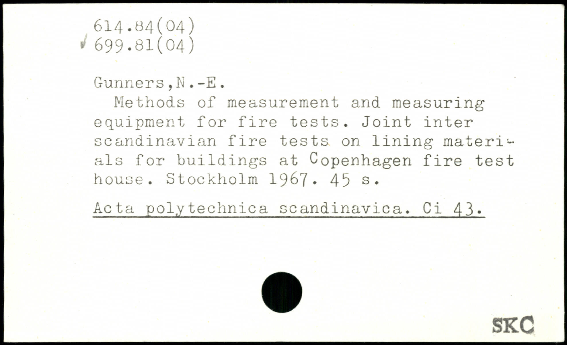 Methods of measurement and measuring equipment for fire tests. Joint inter Scandinavian fire tests on lining materials for buildings at Copenhagen fire test house.