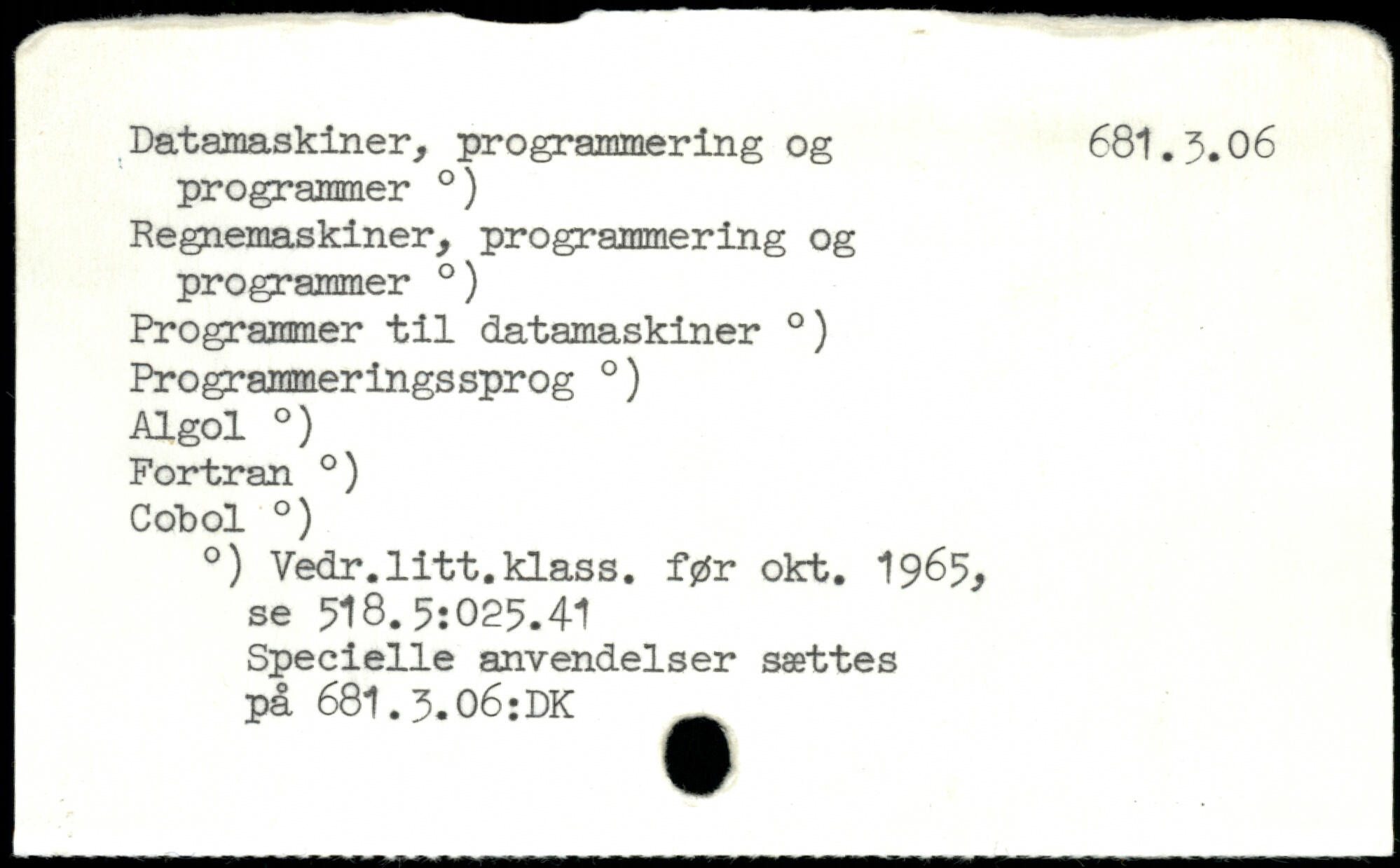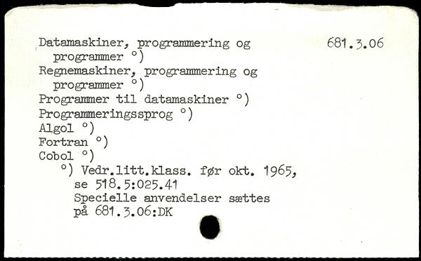 Datamaskiner,, programmering og 681.3.06 programmer .) Regnemaskiner, programmering og programmer .) Programmer til datamaskiner .) Programmeringssprog .) Algol .) Fortran .) Cdbol .) .) Vedr.litt.klass, før okt. 1965, se 518. 5:025.