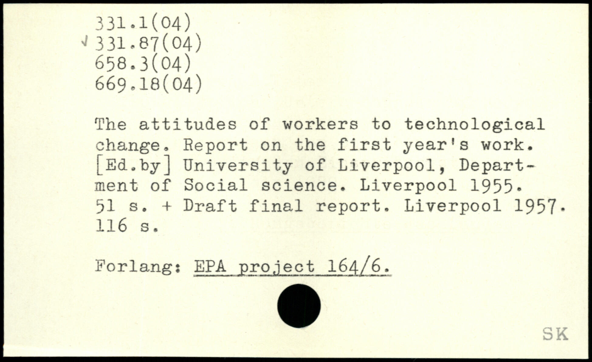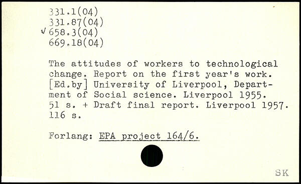 The attitudes of workers to technological change. Report on the first year's work. [Ed,by] University of Liverpool, Department of Social science.