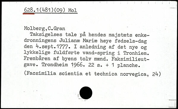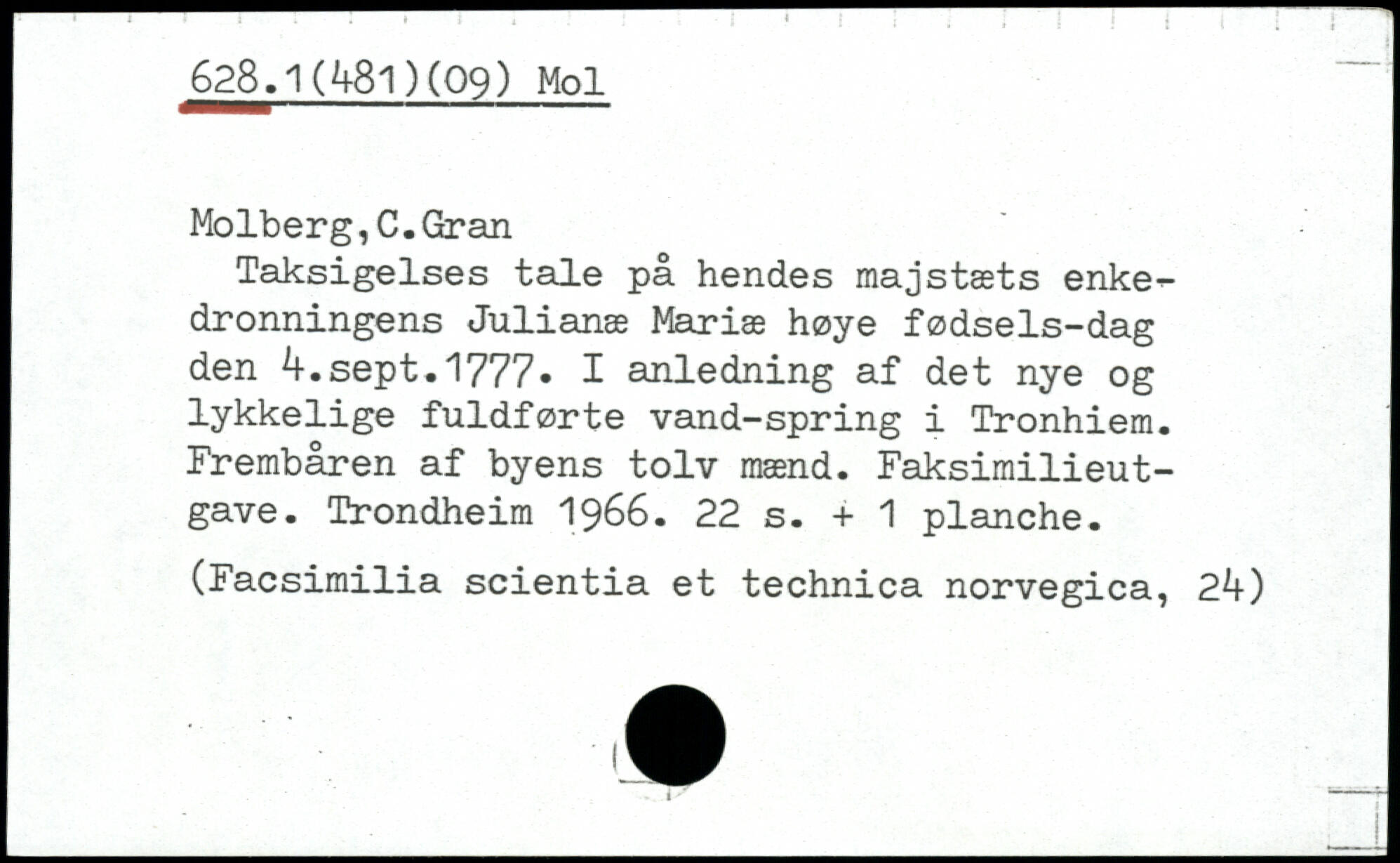 Taksigelses tale på hendes majstæts enkedronningens Julianæ Mariæ høye fødsels-dag den å.sept.1777. I anledning af det nye og lykkelige fuldførte vand-spring i Tronhiem. Frembåren af byens tolv mænd. Faksimilieut-gave.