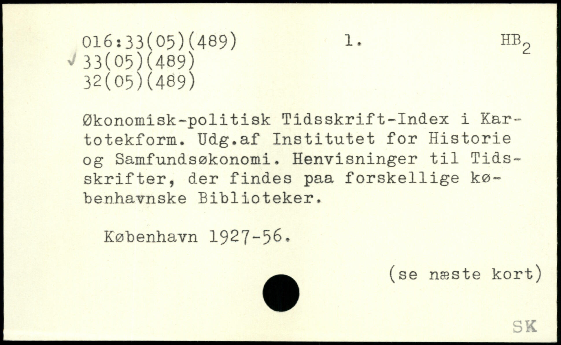 Økonomisk-politisk Tidsskrift-Index i Kartotekform. Udg.af Institutet for Historie og Samfundsøkonomi. Henvisninger til Tidsskrifter, der findes paa forskellige københavnske Biblioteker.