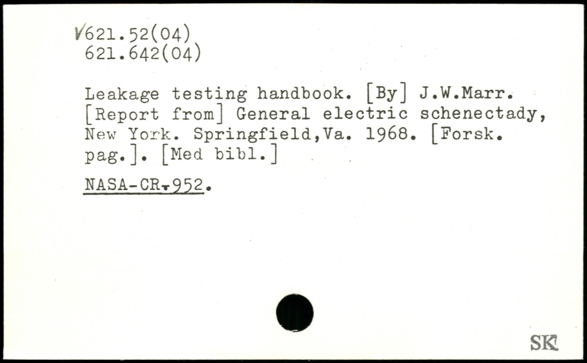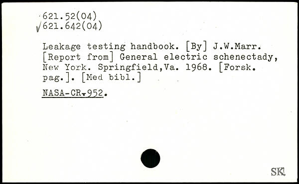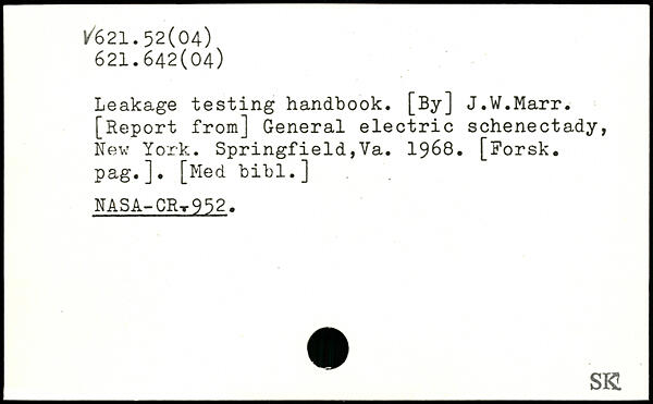 Leakage testing handbook. [By] J.W.Marr. [Report from] General electric Schenectady, New York. Springfield,Va. 1968. [Forsk. pag.]. [Med bibl.] NASA-CRt952.