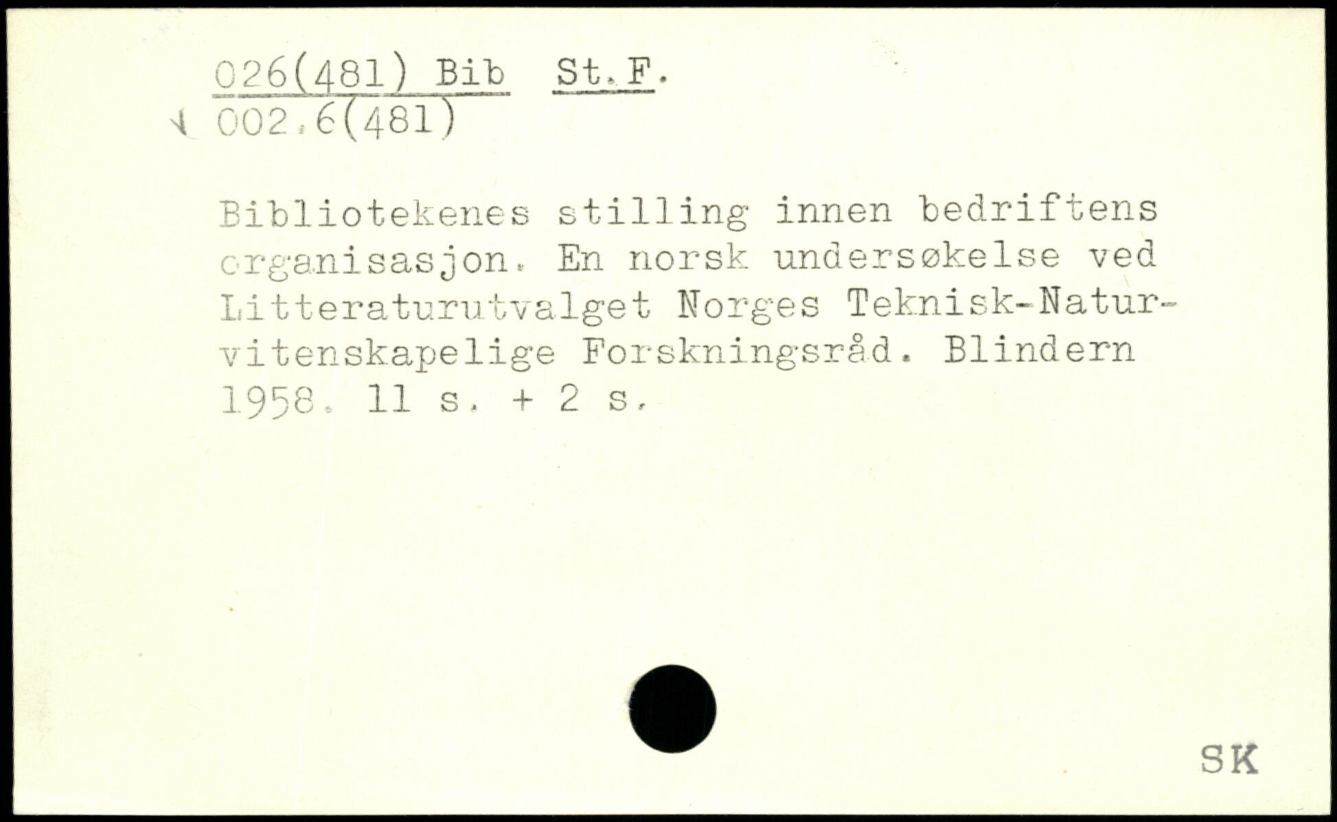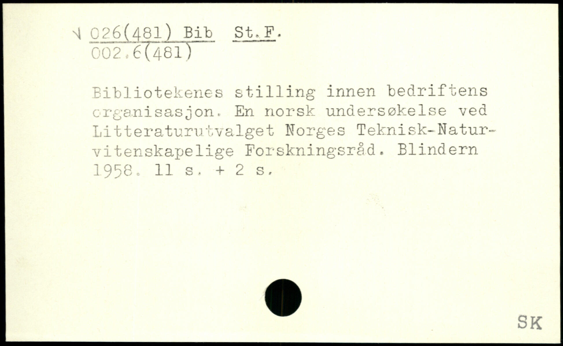 Bibliotekenes st1111ng innen bedriftens organisasjon. En norsk unaersøkelse ved j Litteraturutvalget Norges Teknisk-Natur-vitenskapelige Forskningsråd. Blindem 1958.