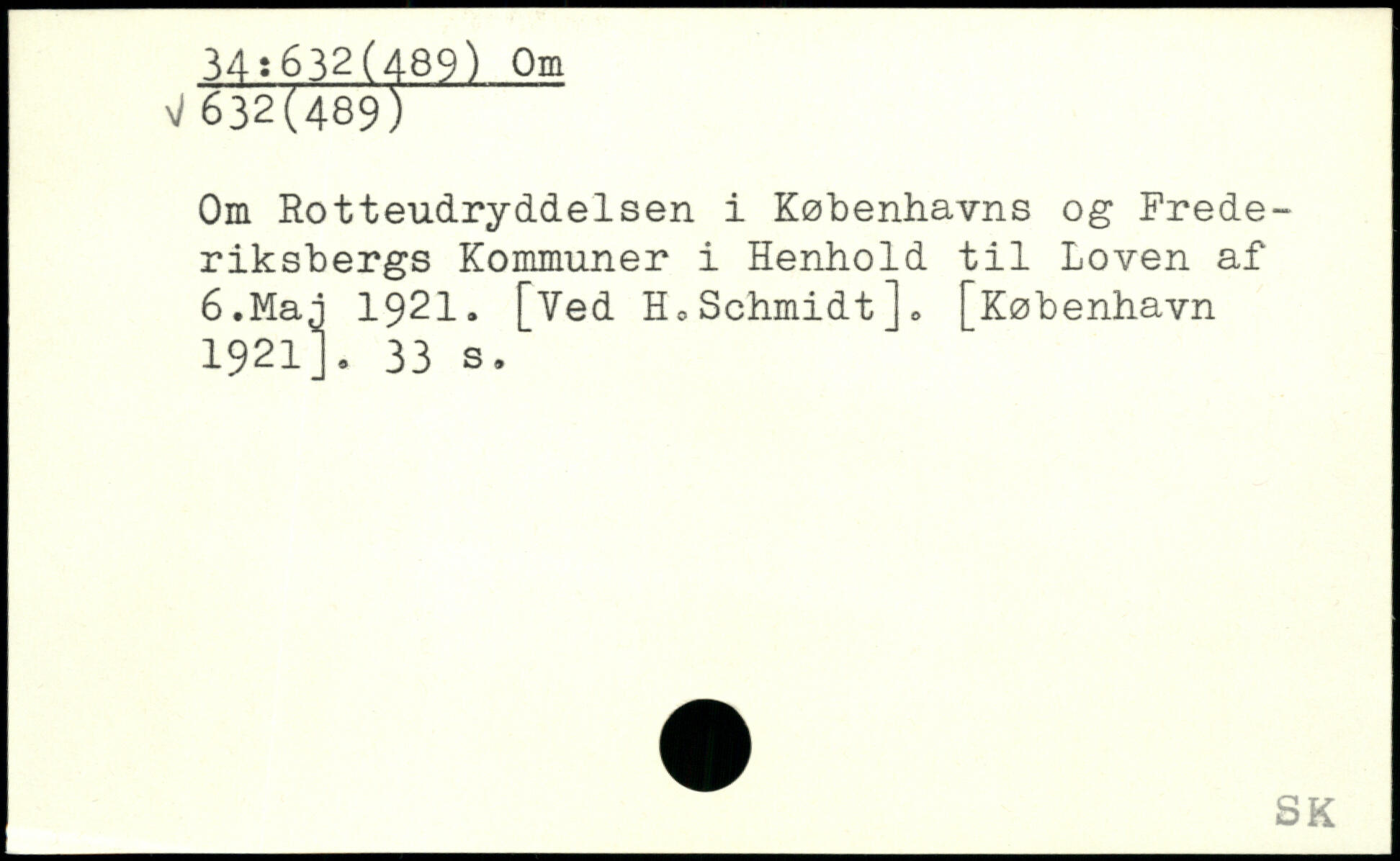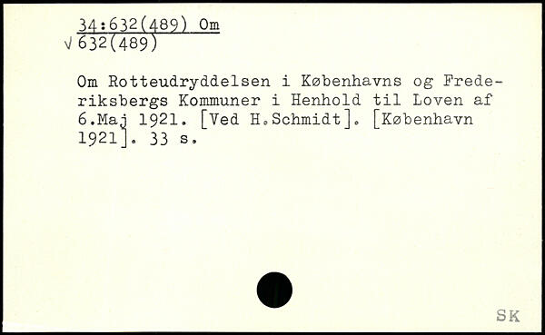 Om Rotteudryddelsen i Københavns og Frede-riksbergs Kommuner i Henhold til Loven af 6.Maj 1921. [Ved H,Schmidt]