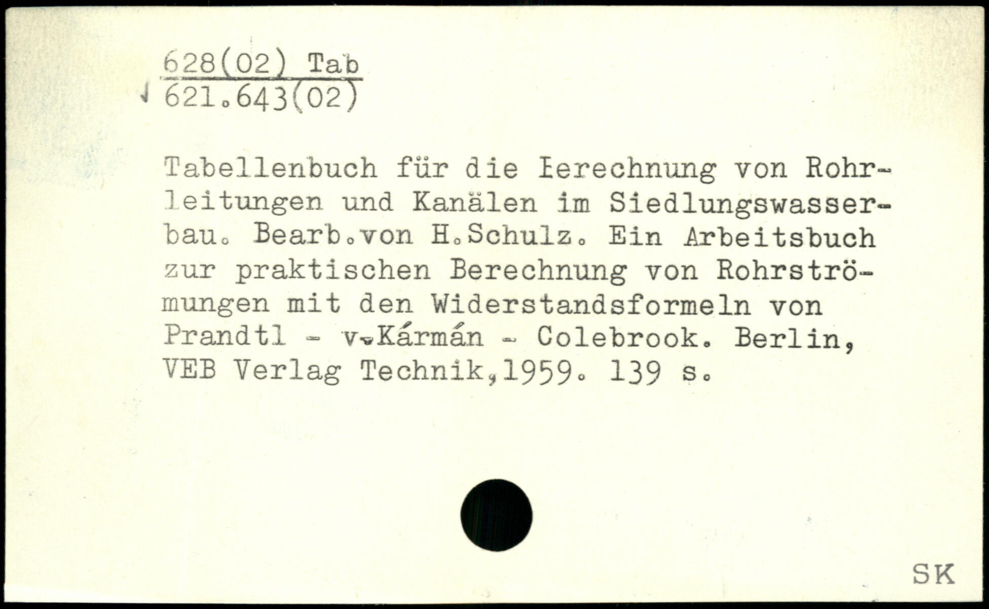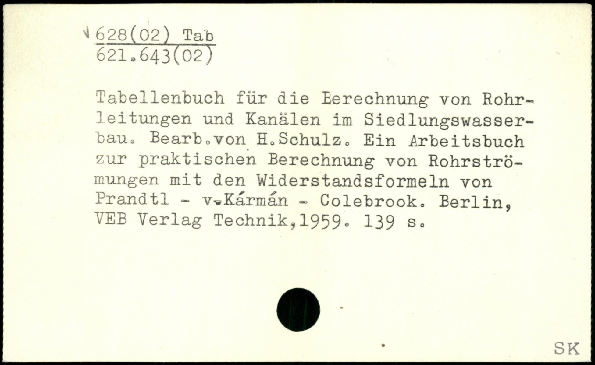 Tabellenbuch für die Berechnung von Rohr-1eitungen und Kanälen im Siedlungswasser-bauo Bearbovon H0Schulz, Ein Arbeitsbuch zur praktischen Berechnung von Rohrströmungen mit den Widerstandsformeln von Prandtl - v^Karman - Colebrook.