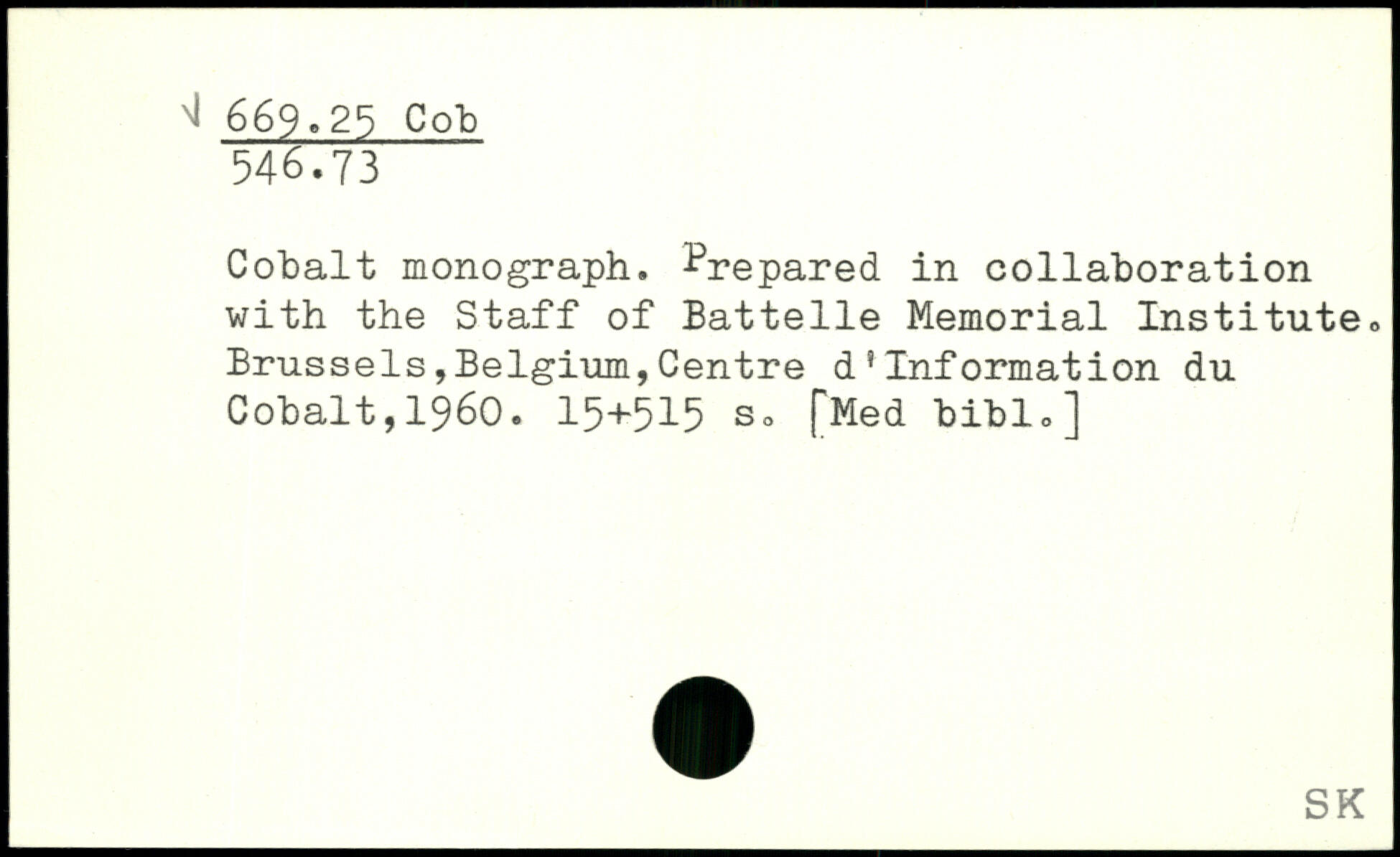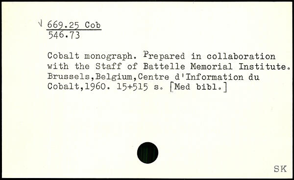 Cobalt monograph. Prepared in collaboration with the Staff of Battelle Memorial Institute. Brussels,Belgium,Centre d?Information du Cobalt,1960.