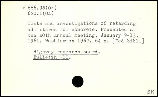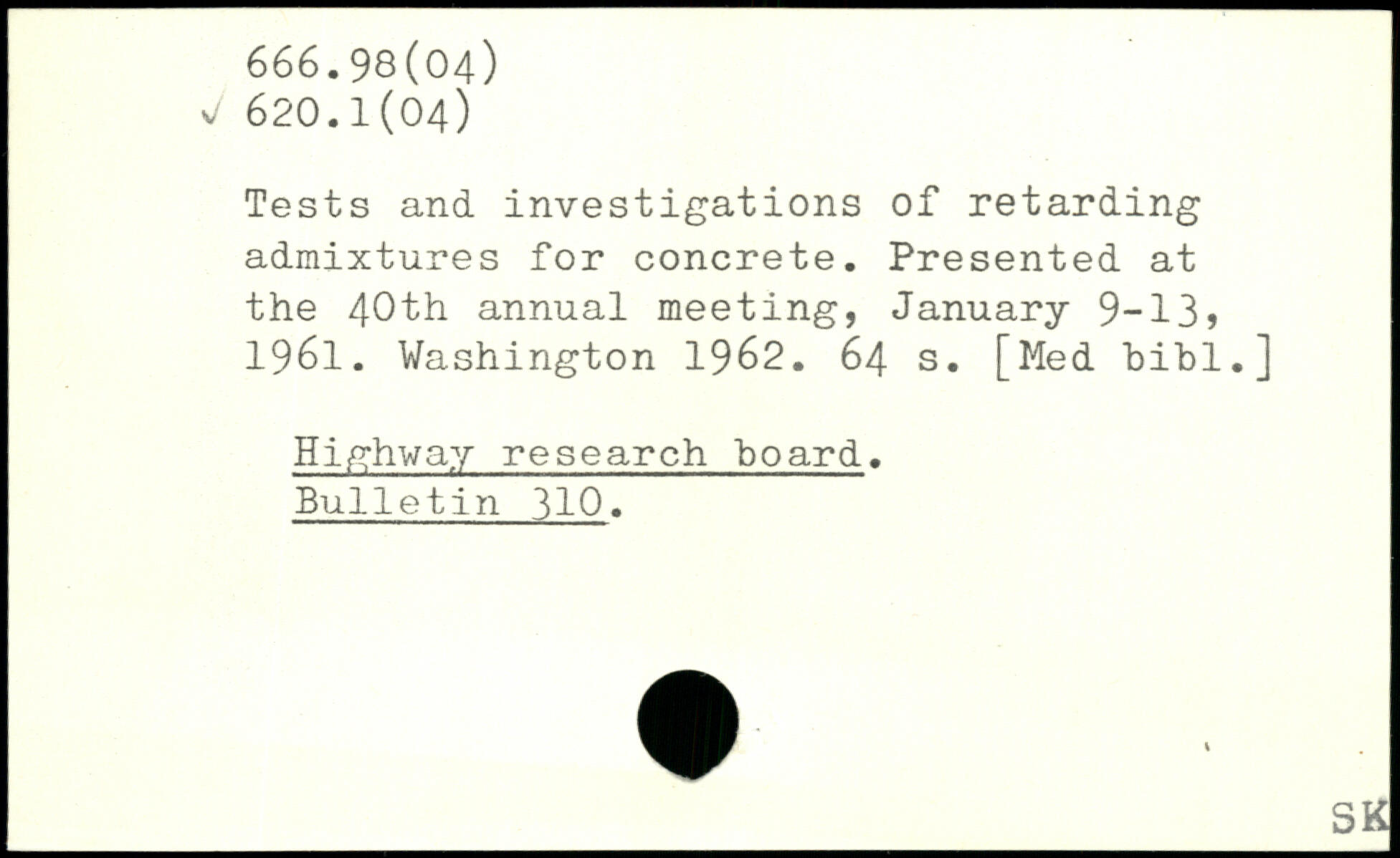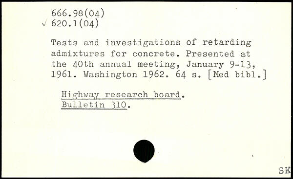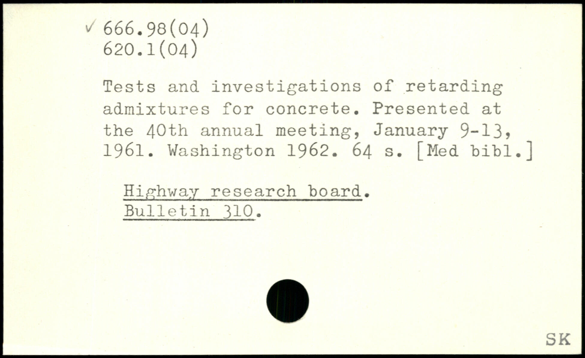 Tests and investigations of retarding admixtures for concrete. Presented at the 40th annual meeting, January 9-13, 1961.