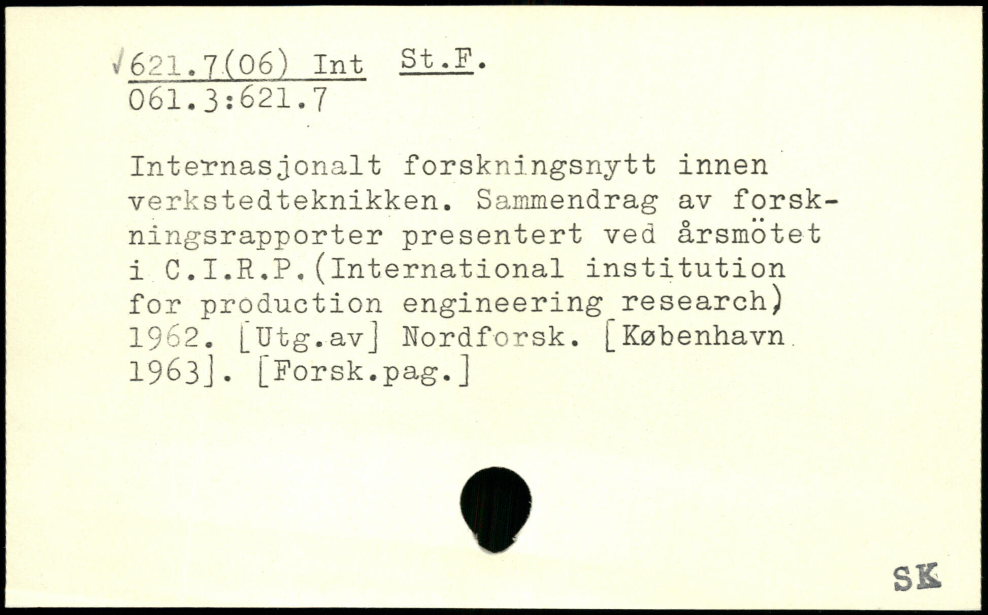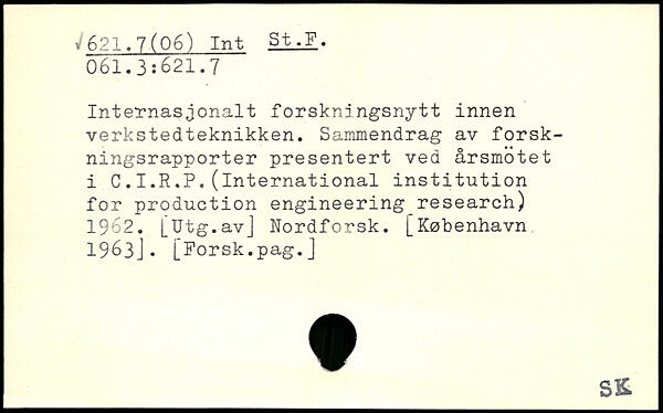 Internasjonalt forskningsnytt innen verkstedteknikken. Sammendrag av forskningsrapporter presentert ved årsmotet i C.I.R.P,(international institution for production engineering research) 1962. [Utg.avJ Nordforsk.