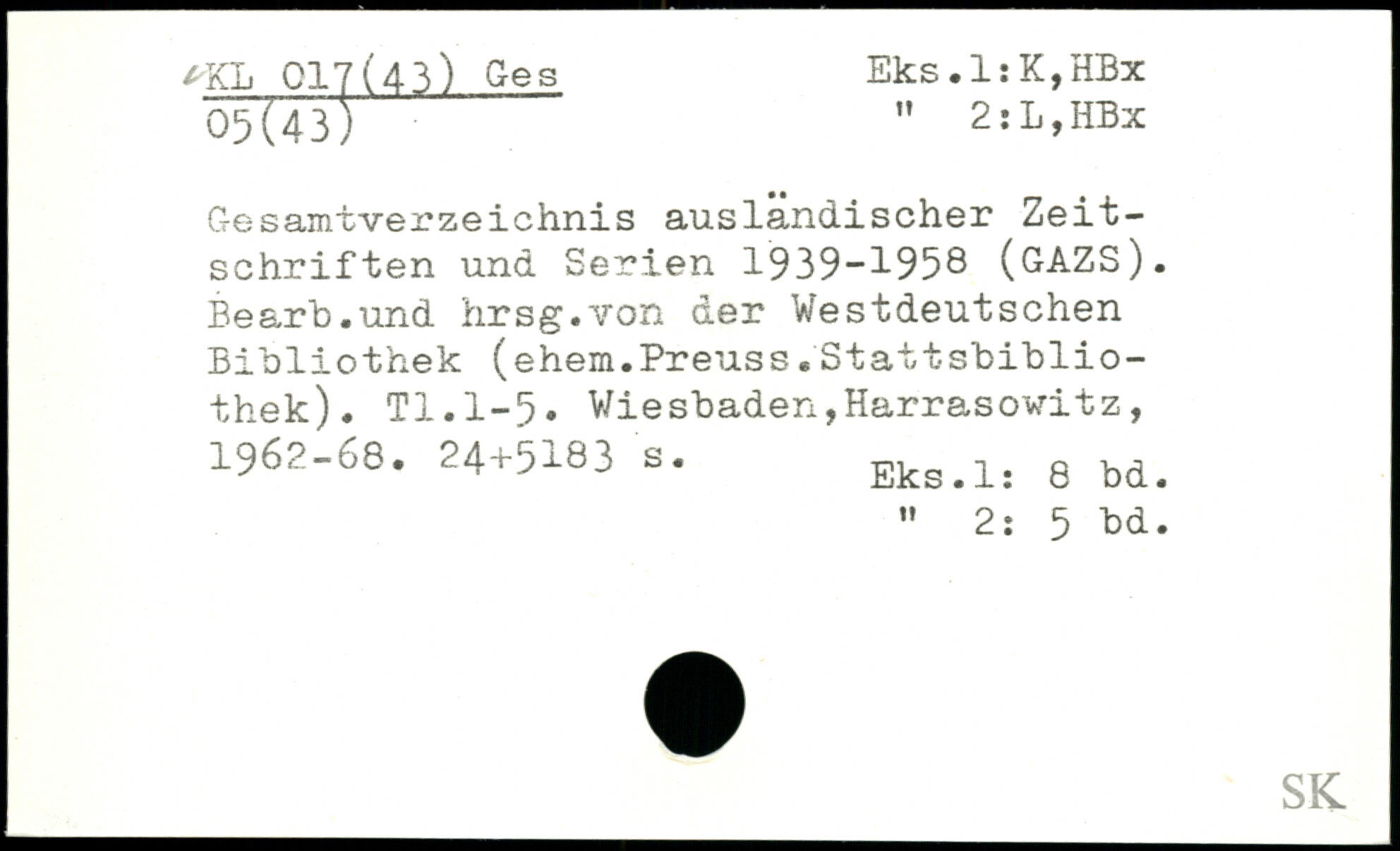 Gesamtverzeichnis ausländischer Zeitschriften und Serien 1939-1958 (GAZS). Bearh.und hrsg.von der Westdeutschen Bibliothek (ehern.Preuss s Stattsbibliothek). TI. 1-5.