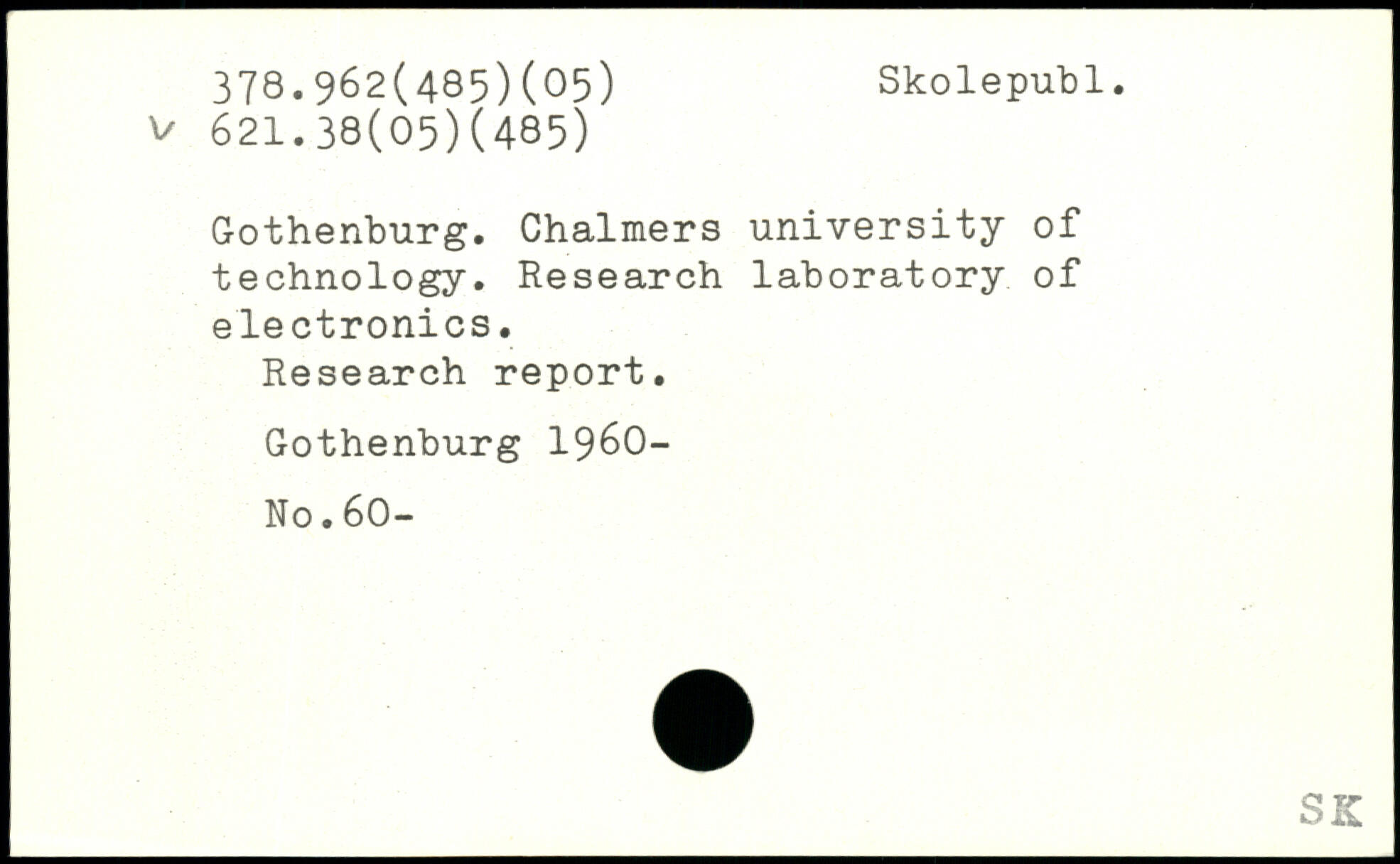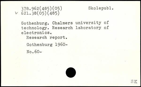 Gothenburg. Chalmers university of technology. Research laboratory of electronics. Research report. Gothenburg 1960- No.60-