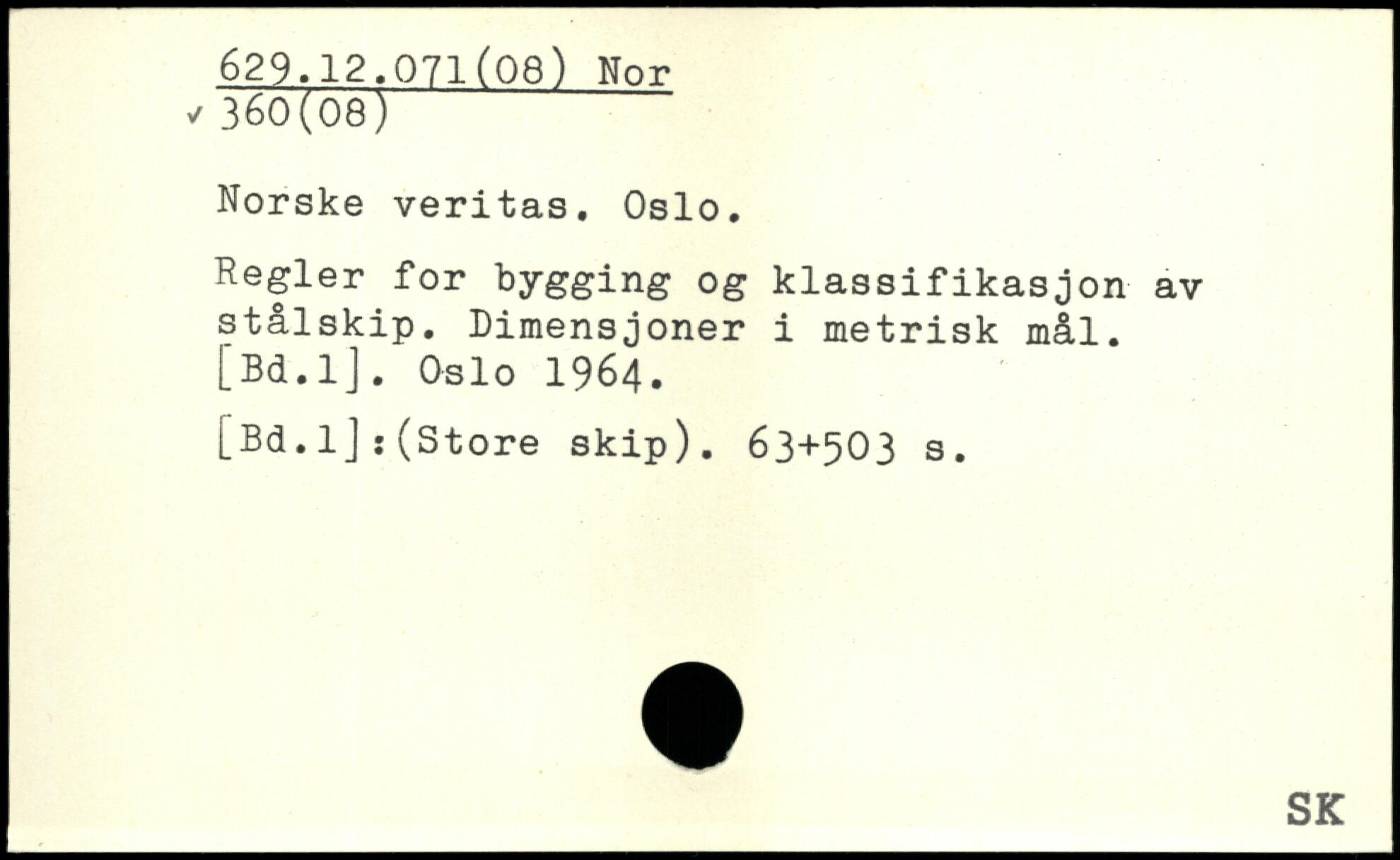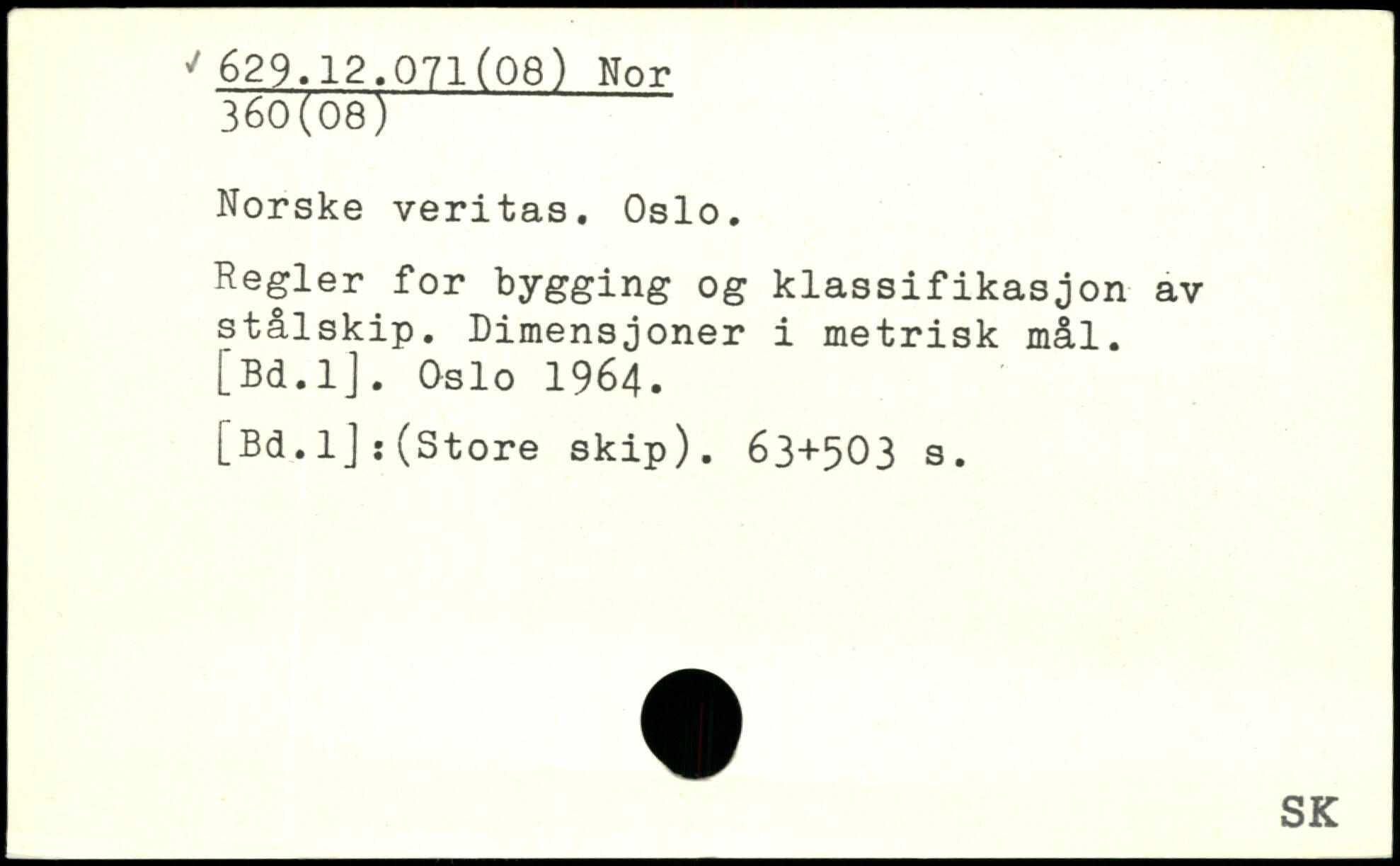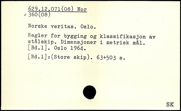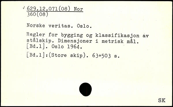 Norske veritas. Oslo. Regler for bygging og klassifikasjon av stålskip. Dimensjoner i metrisk [Bd.lJ. Oslo 1964. [Bd.lj:(Store skip).