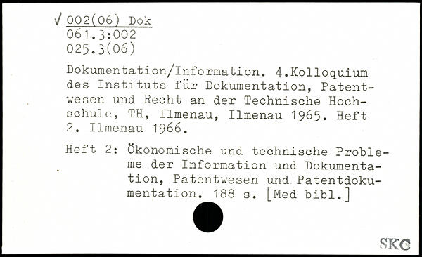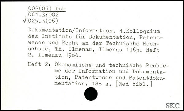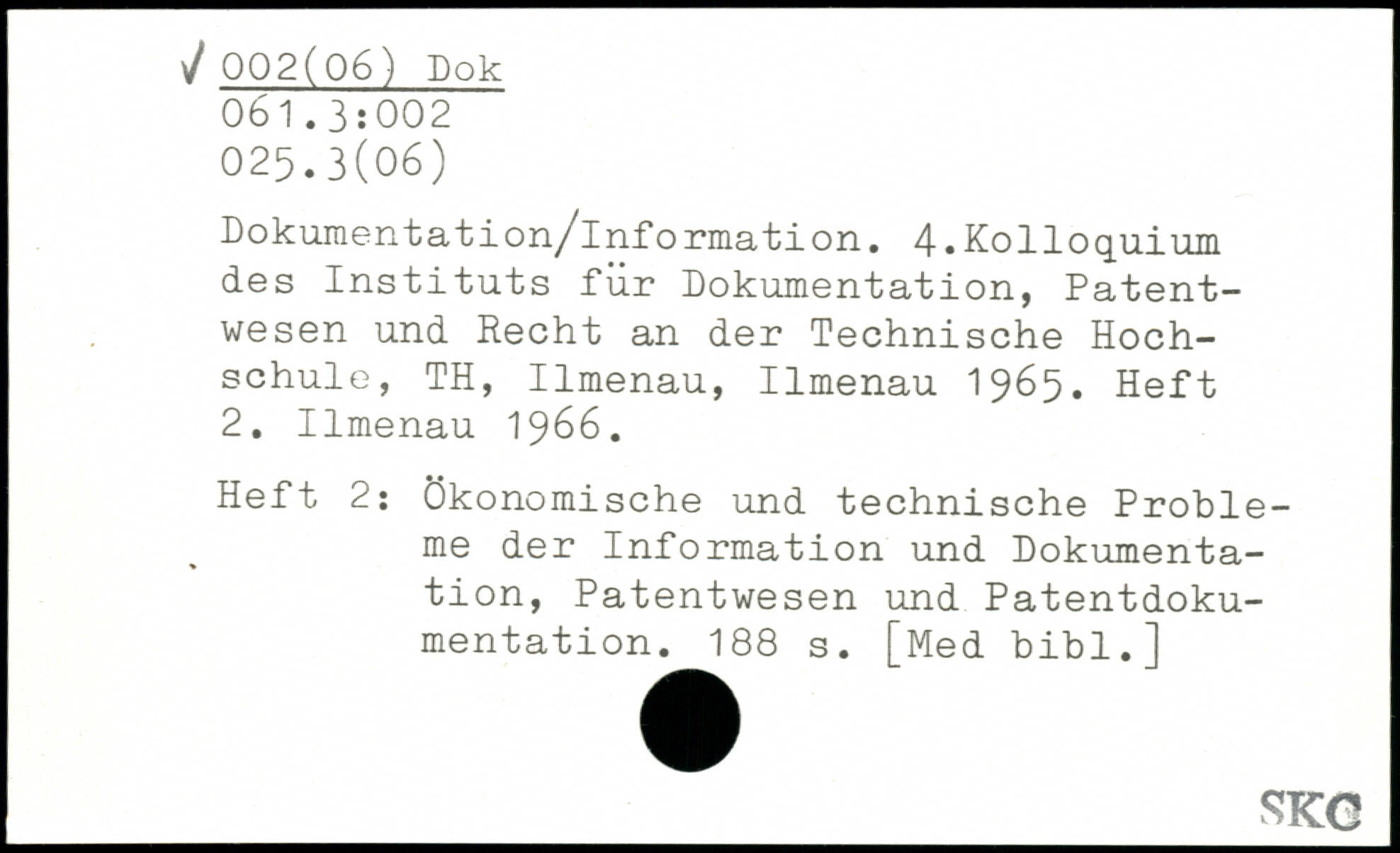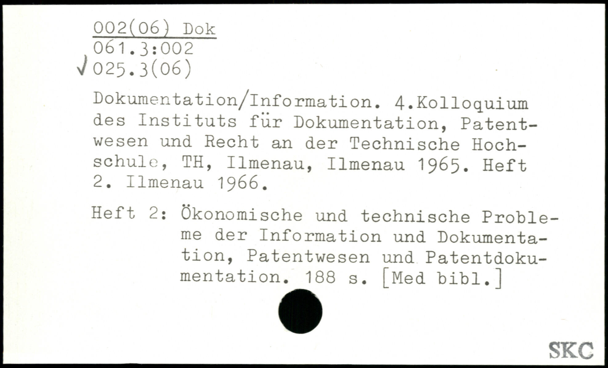 Dokumentation/lnformation. 4.Kolloquium des Instituts fur Dokumentation, Patentwesen und Hecht an der Technische Hochschule, TH, Ilmenau, Ilmenau 1965. Heft 2. Ilmenau 1966. Heft 2: Ökonomische und technische Probleme der Information und Dokumentation, Patentwesen und Patentdokumentation.