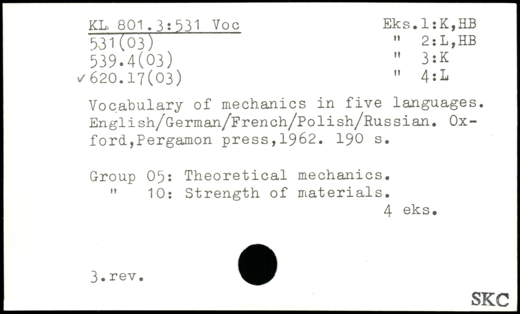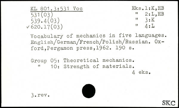 Vocabulary of mechanics in five languages. English/German/French/Polish/Russian.