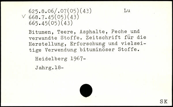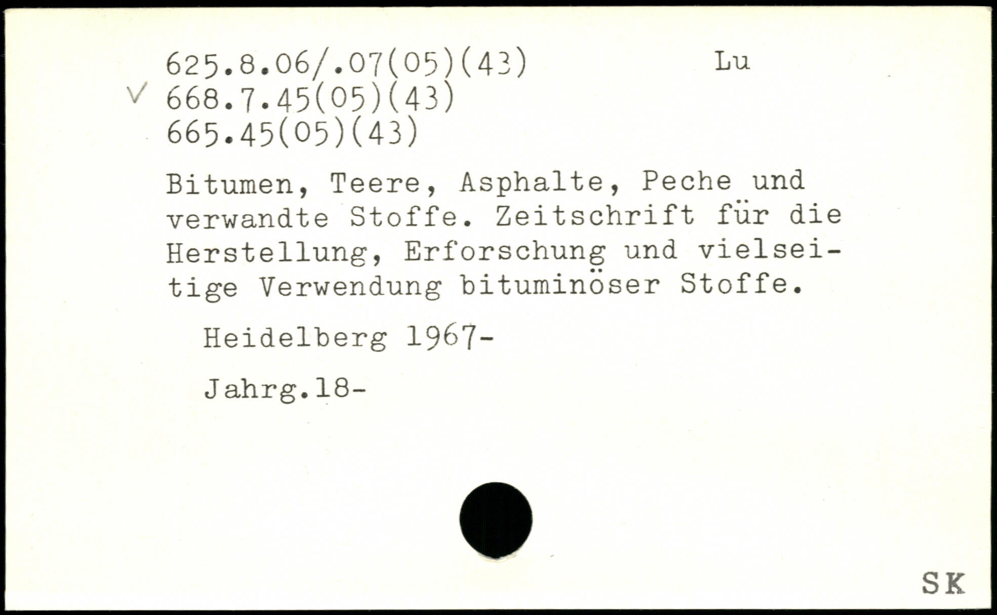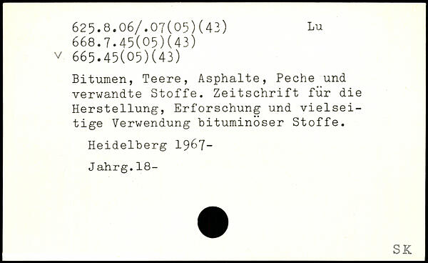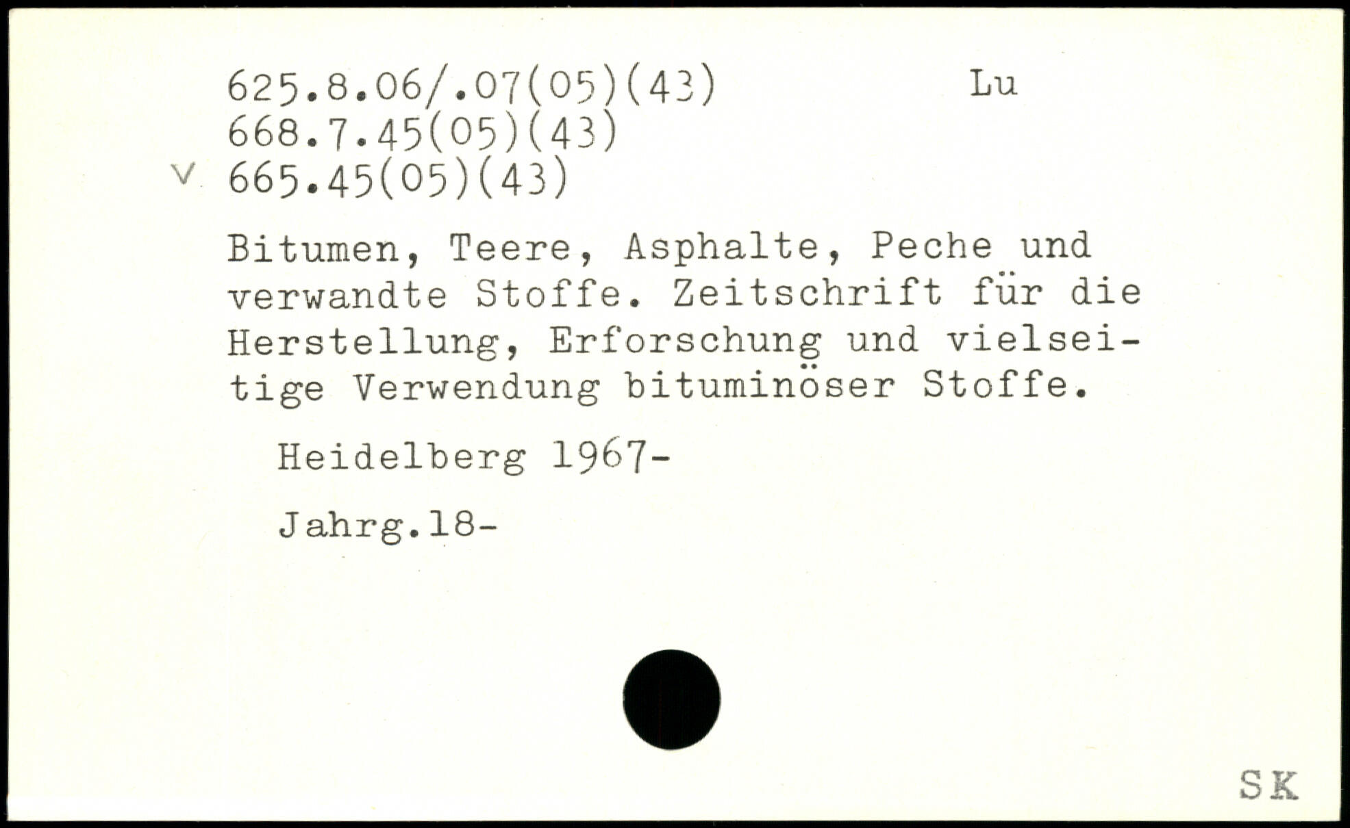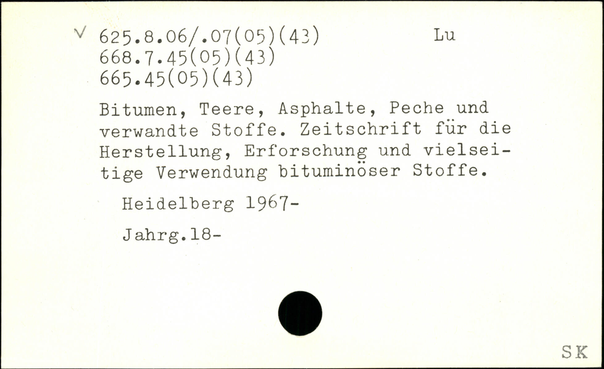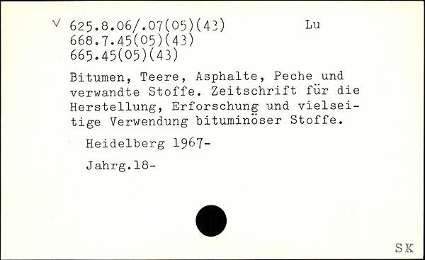 Bitumen, Teere, Asphalte, Peche und verwandte Stoffe. Zeitschrift für die Herstellung, Erforschung und vielseitige Verwendung bituminöser Stoffe. Heidelberg 1967- J ahrg.18-