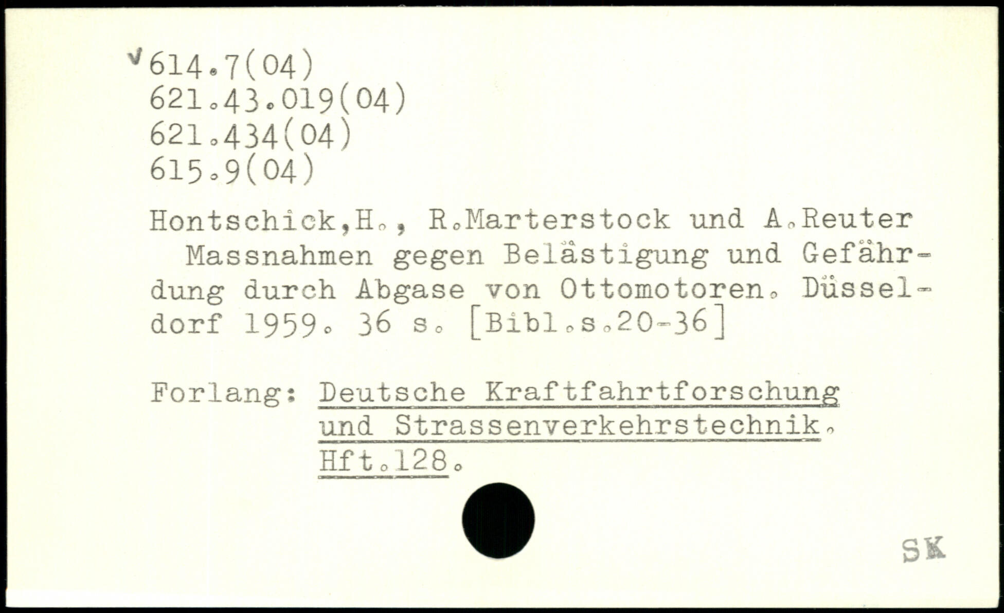 Hontschick,Ho, RoMarterstock und AnReuter Massnahmen gegen Belästigung und Gefährdung durch Abgase von Ottomotoren, Düsseldorf 1959 o