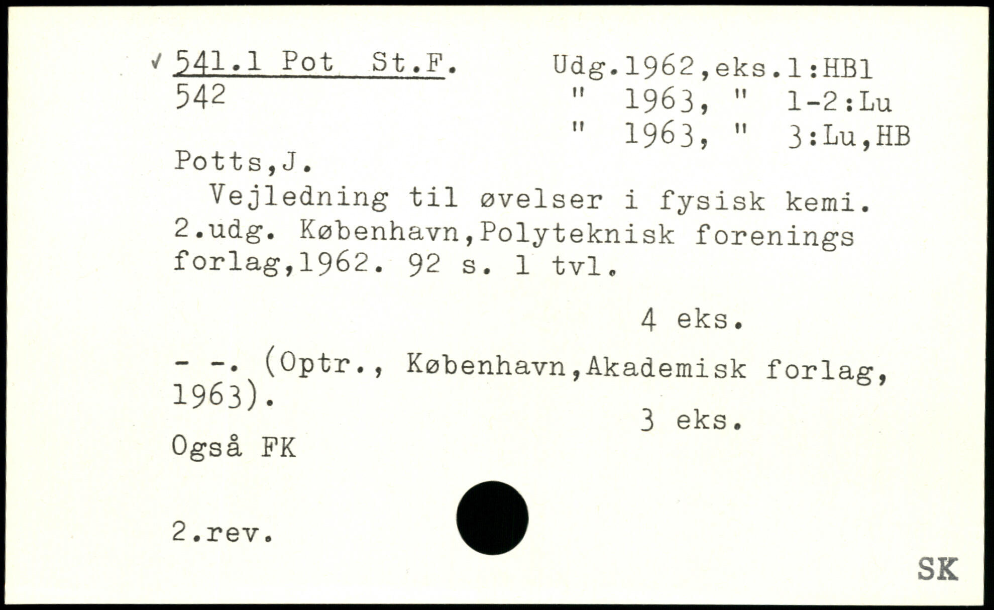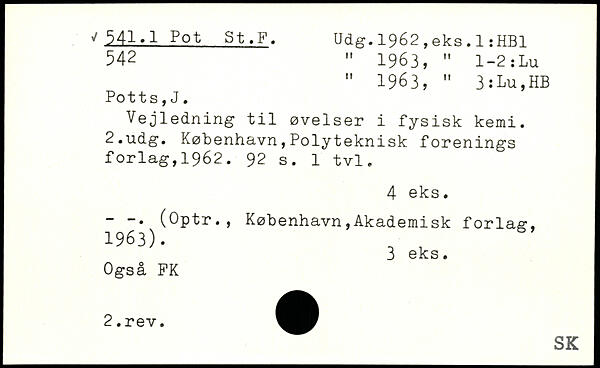 " 1963, " 3:Lu,HB Potts,J. Vejledning til øvelser i fysisk kemi.