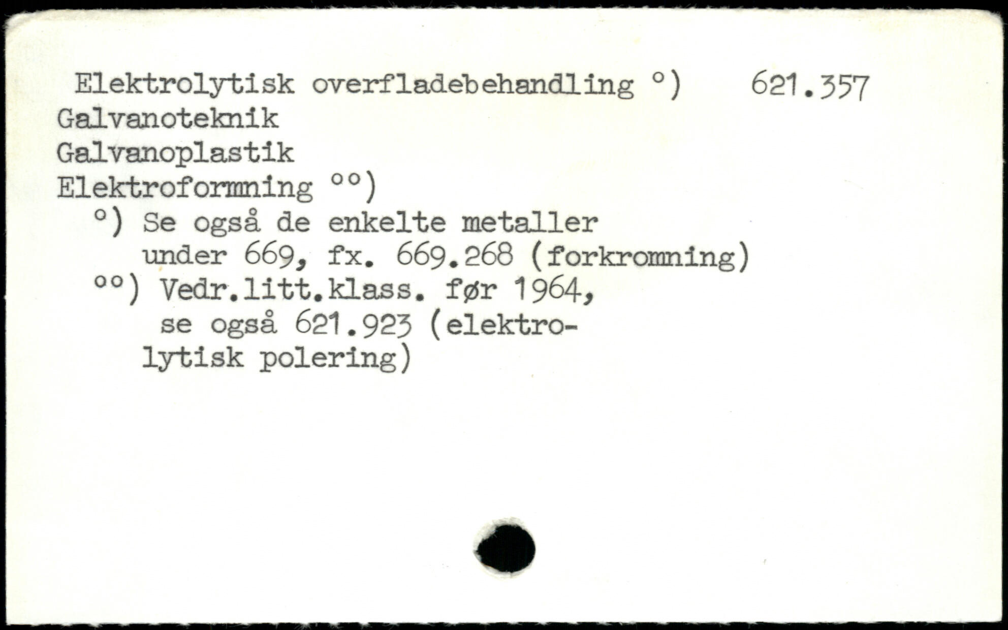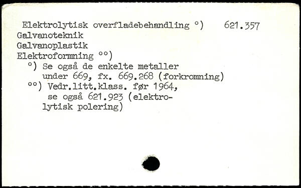Elektrolytisk overfladebehandling .) 621.357 Galvanoteknik Galvanoplastik Elektroformning ..) .) Se også de enkelte metaller under 669, fx. 669.268 (forkromning) 00) Vedr.litt.klass. før 1964. se også 621.923 (elektrolytisk polering)