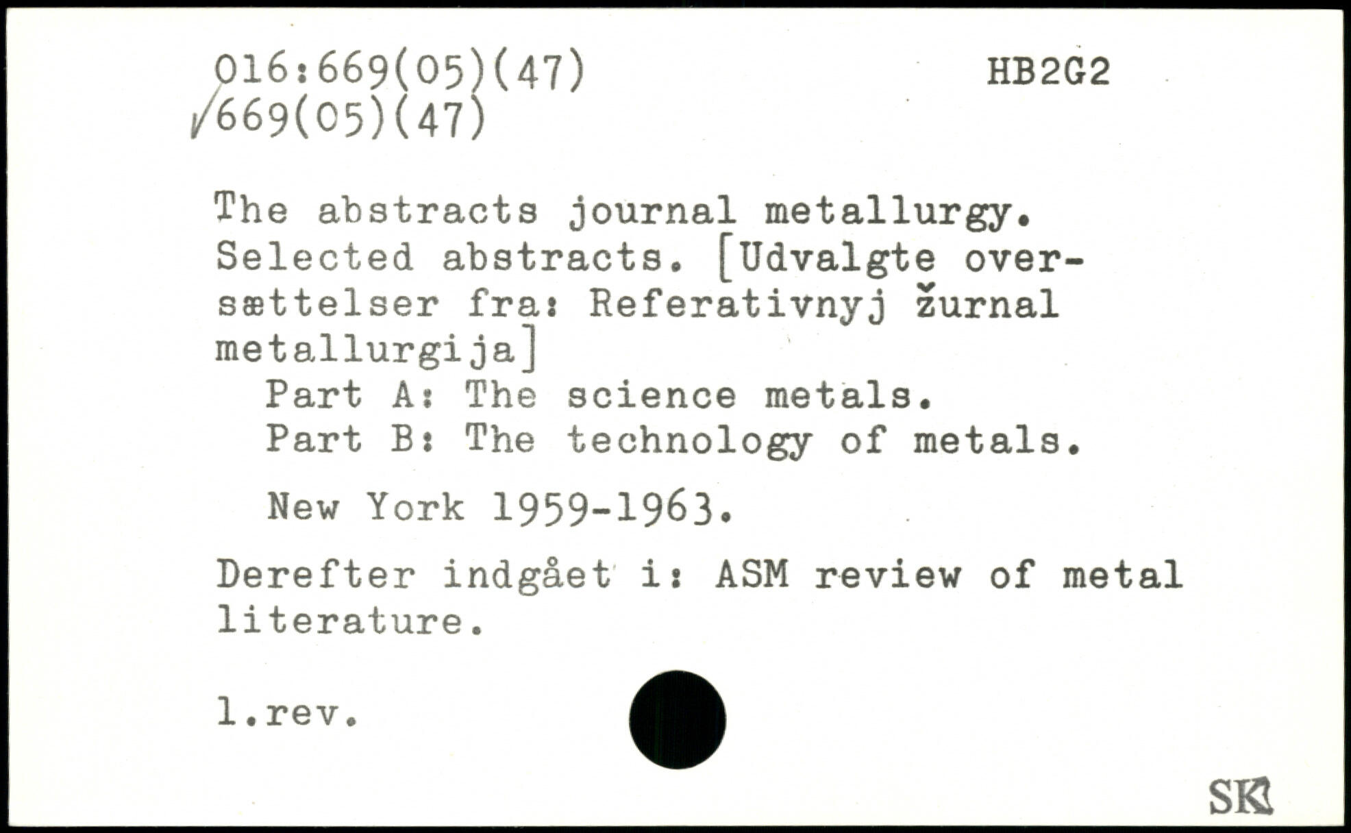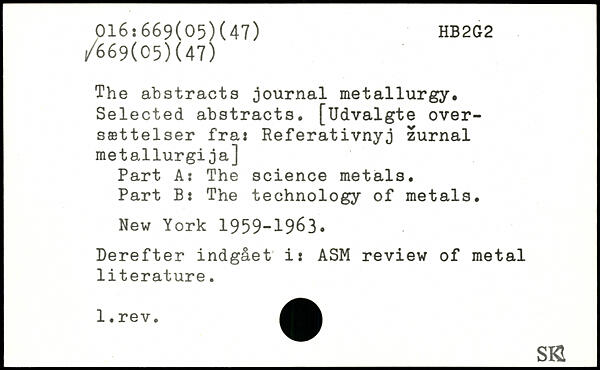 The abstracts journal metallurgy. Selected abstracts. [Udvalgte oversættelser fra: Referativnyj zurnal metallurgija] Part A: The science metals. Part B: The technology of metals.