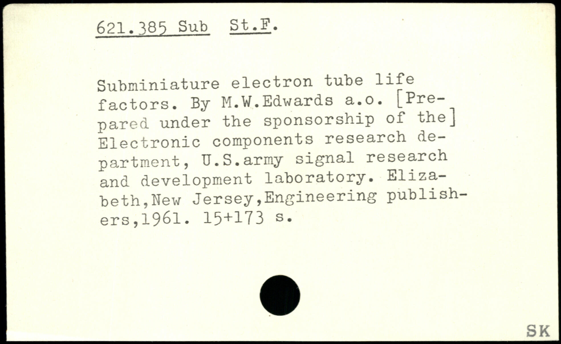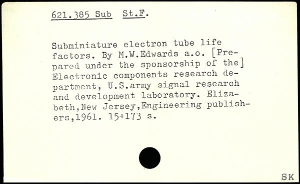 Subminiature electron tube life factors. By M.W.Edwards a.o. [Prepared under the sponsorship of the] Electronic components research department, U.S.army signal research and development laboratory.