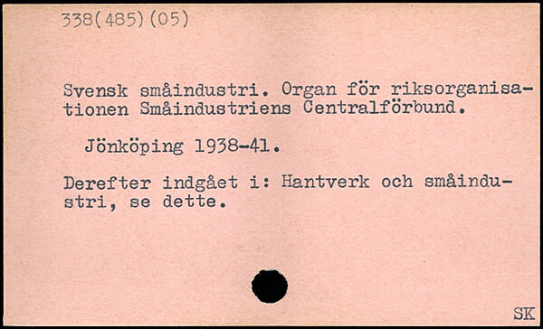 Svensk småindustri. Organ för riksorganisationen Småindustriens Centralförbund, Jönköping 1938-41, Derefter indgået i: Hantverk och småindustri, se dette.